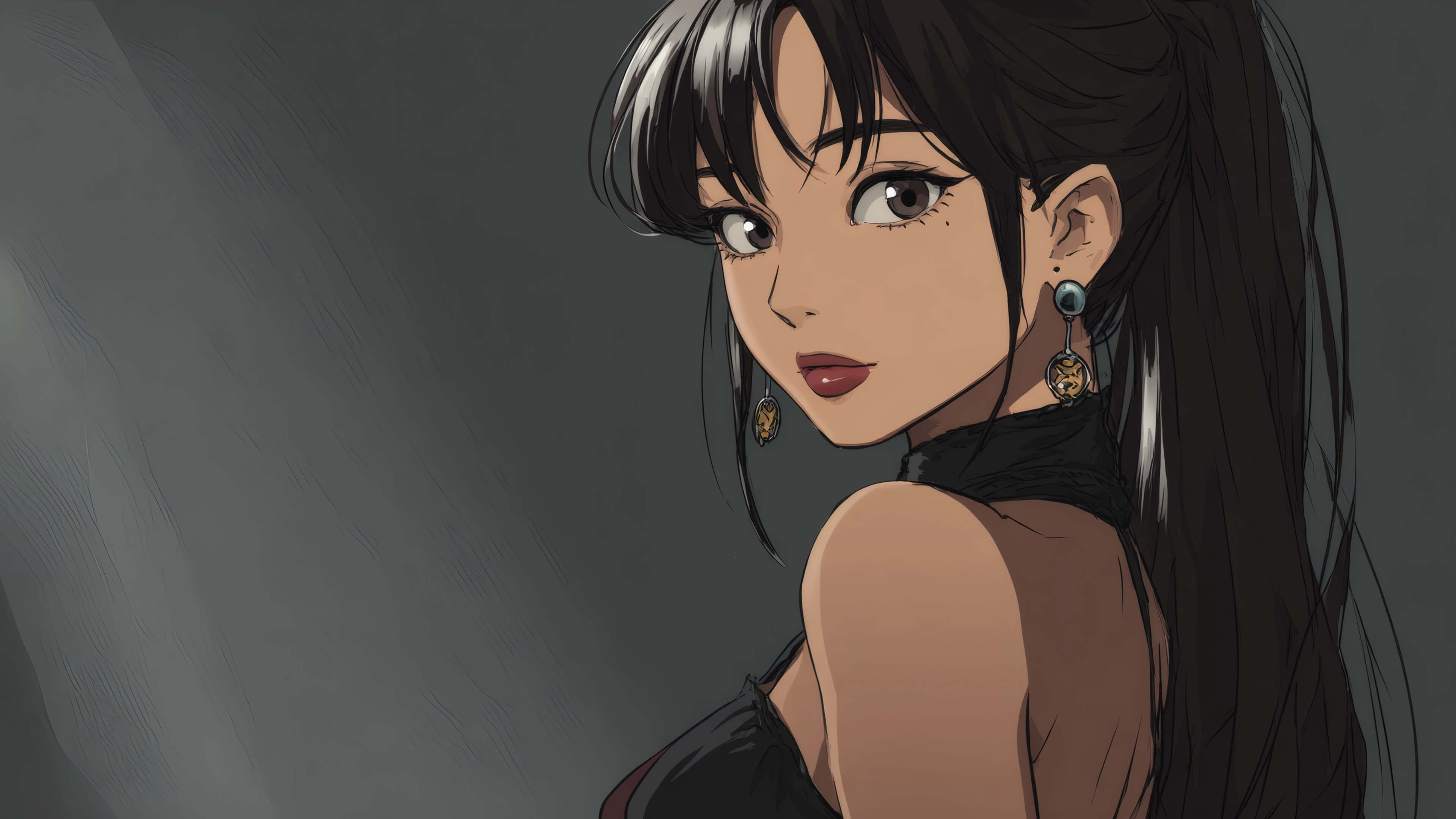 Digital anime portrait of a brunette woman with long hair in a high ponytail, wearing a black dress and ornate earrings, gazing over her shoulder against a dark background.