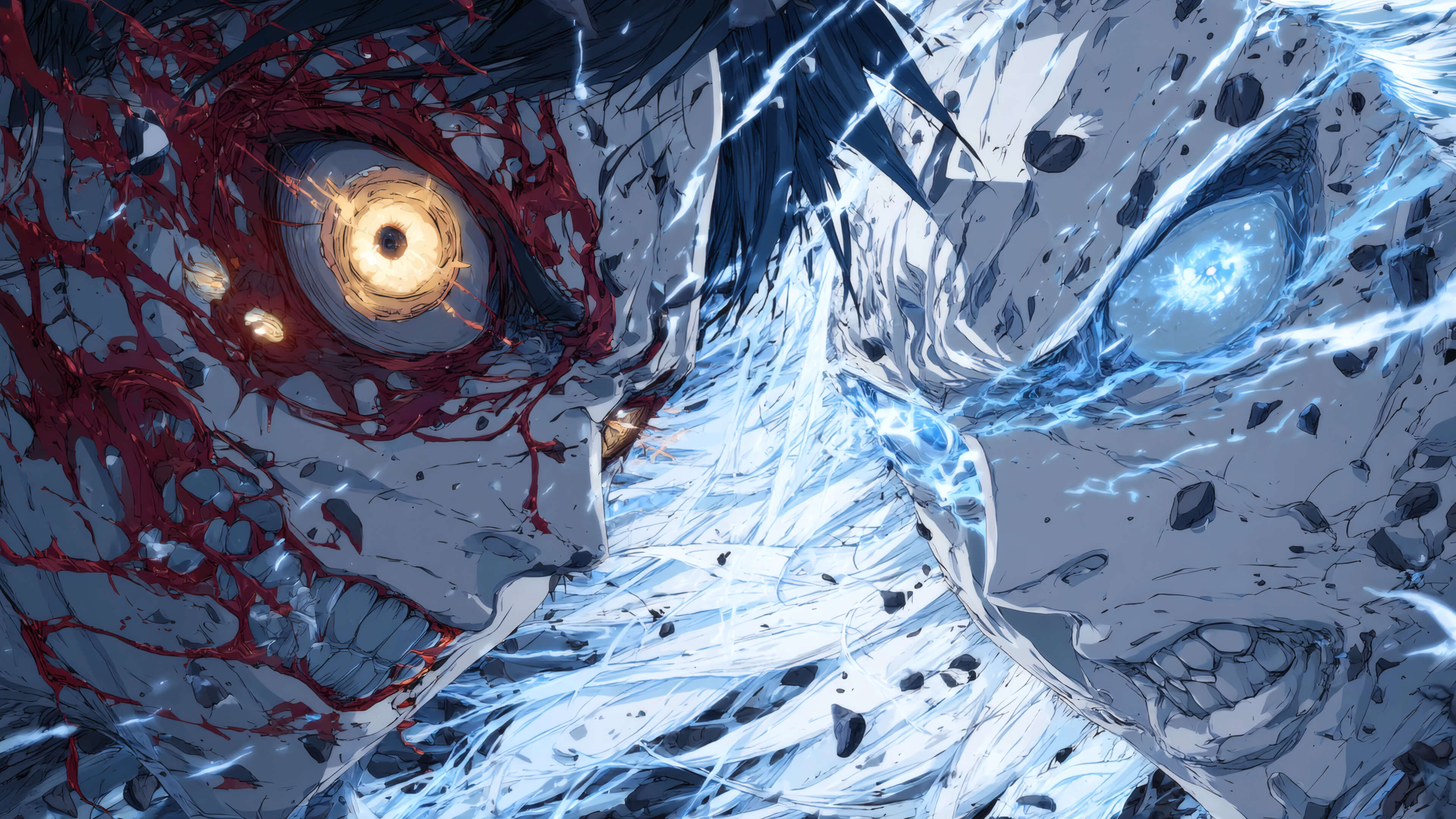 A hyper-detailed anime showdown capturing two fierce warriors in an intense face-off - one engulfed in blood and raw rage with glowing golden eyes, the other radiating electrifying blue energy from piercing ice-blue eyes. The scene explodes with power, debris, and motion, embodying the ultimate moment before impact. Perfect for dark fantasy, shonen anime aesthetics, and high-energy battle art collections.