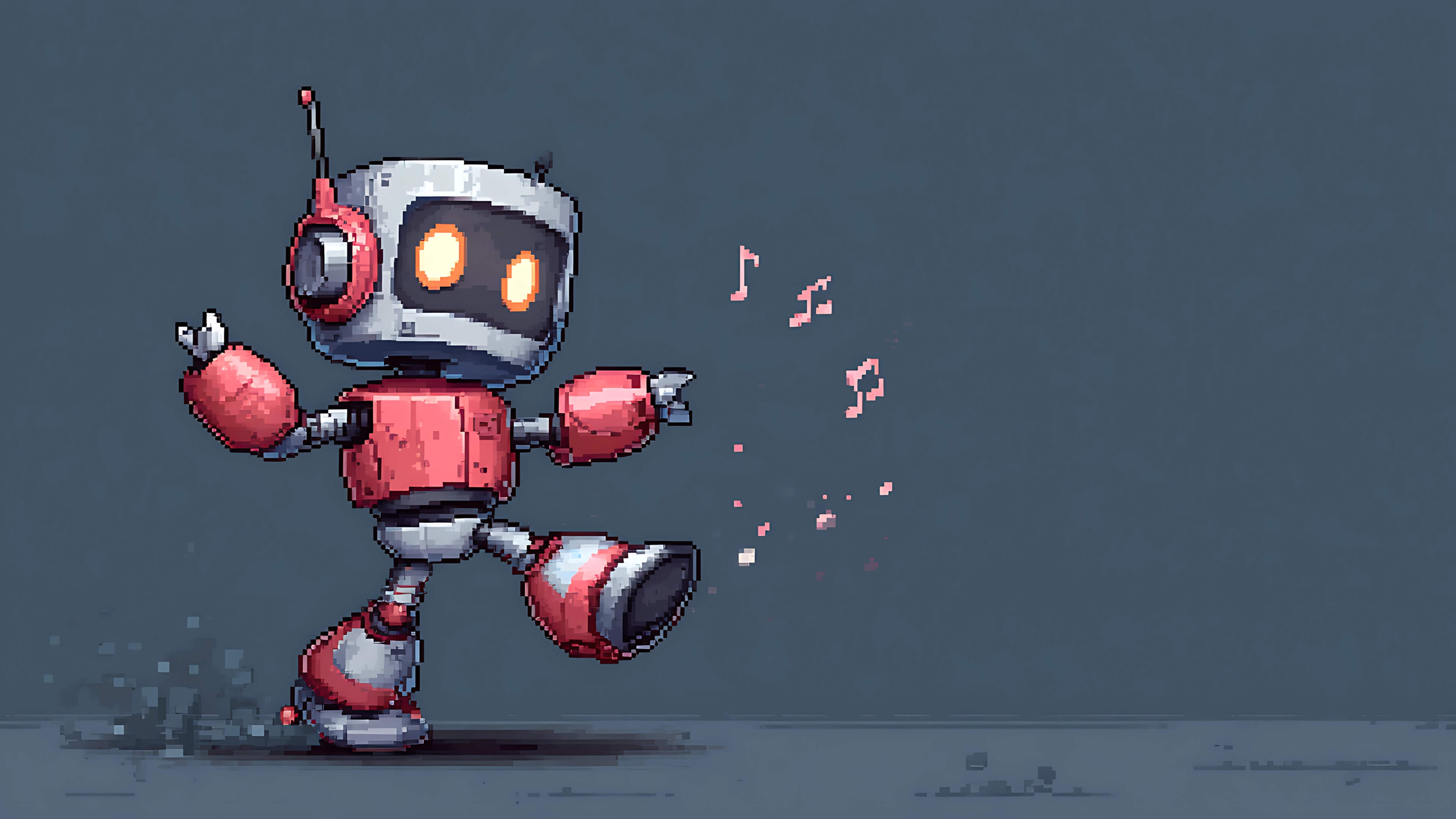 Cute pixel art robot dancing with glowing orange eyes and floating pink music notes in a retro game-style scene.