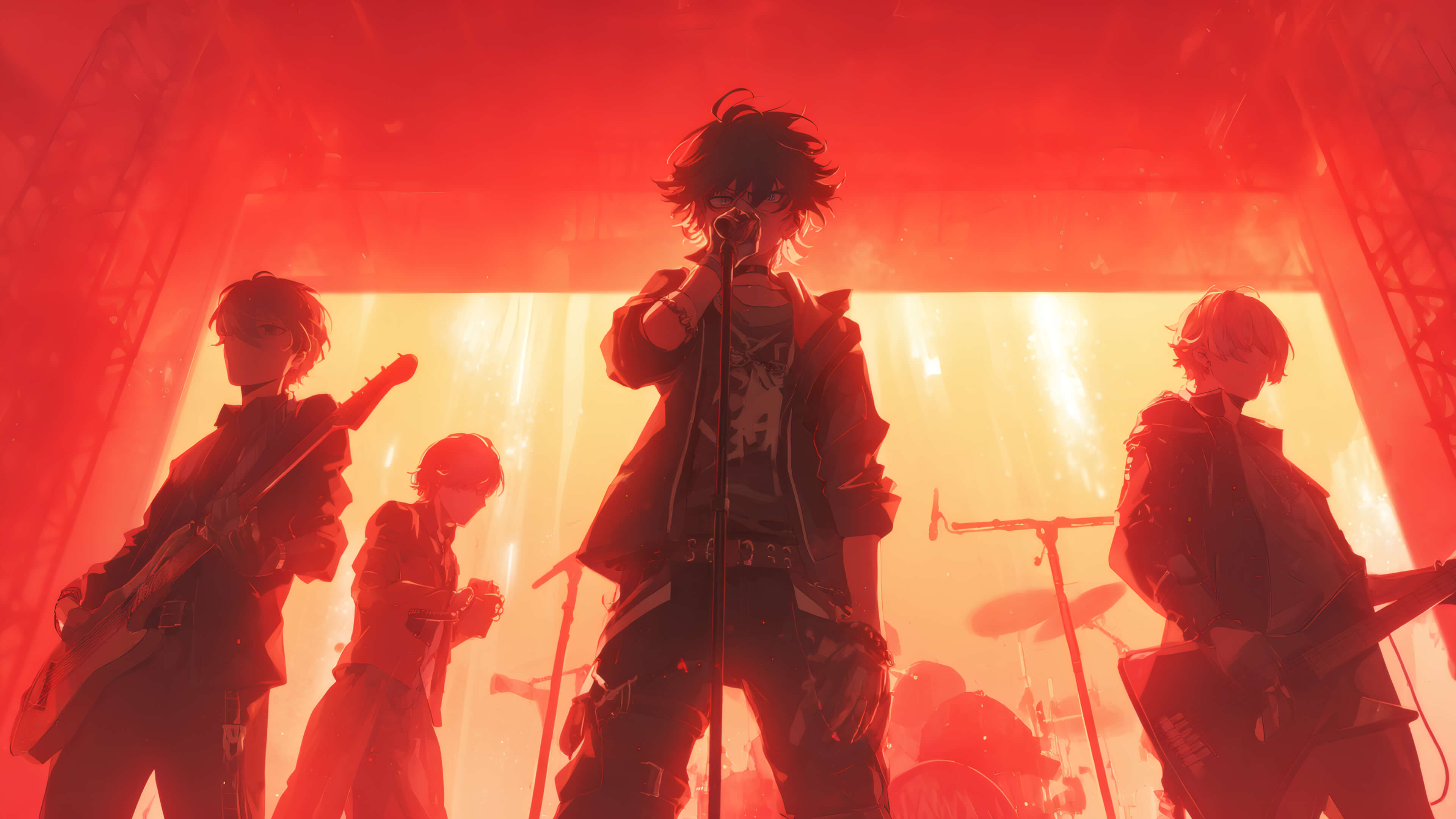 anime, band, concert, rock band, singer, live music, mic, anime stage, punk, energetic, spotlight, red lights, music performance, electric guitar, music scene, anime concert, passion, loud, anime rockstar, animated music vibes