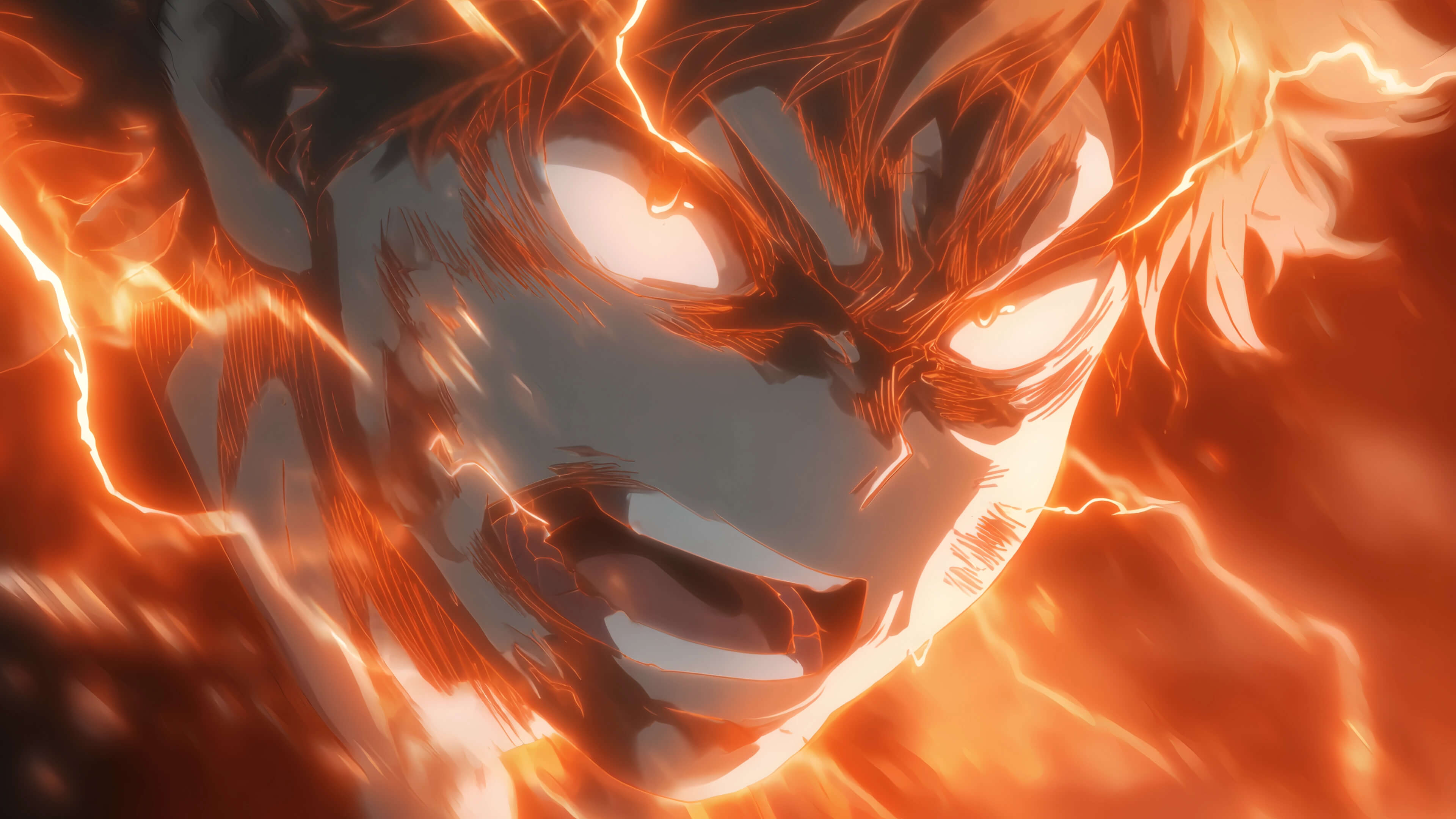 anime fire lightning, anime power up, anime transformation, intense anime close-up, anime rage scene, anime glowing eyes, shonen anime power moment, anime hero in flames, anime battle aura, high detail anime illustration, anime energy effects, anime super mode, Japanese anime style, anime fiery awakening, anime epic scene
