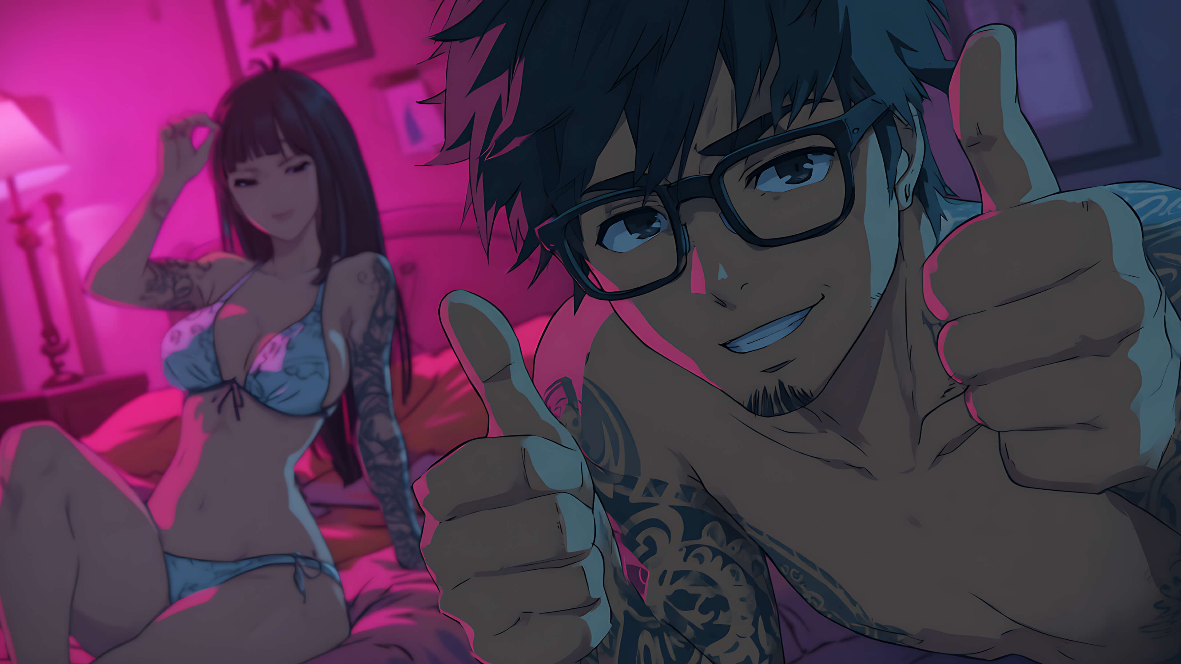 Anime-style man with tattoos and glasses giving a double thumbs-up in a pink-lit bedroom, with a tattooed woman in lingerie smiling in the background.