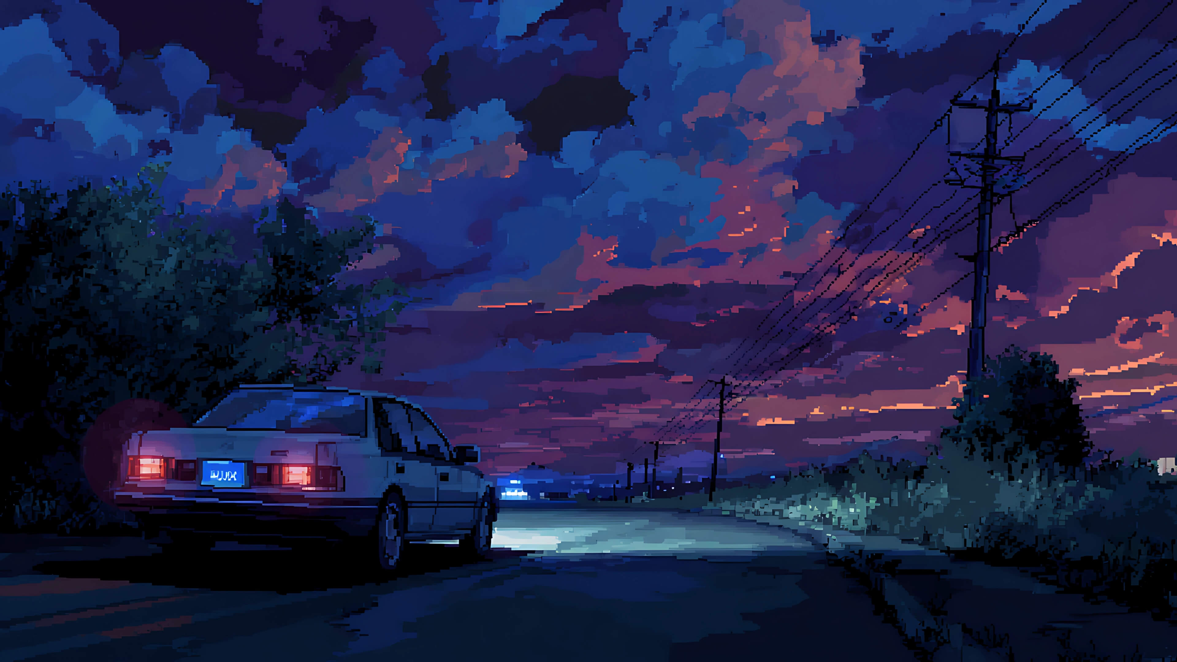 Pixel art of a car parked on a dimly lit road at night with a glowing sunset sky filled with purple and pink clouds.