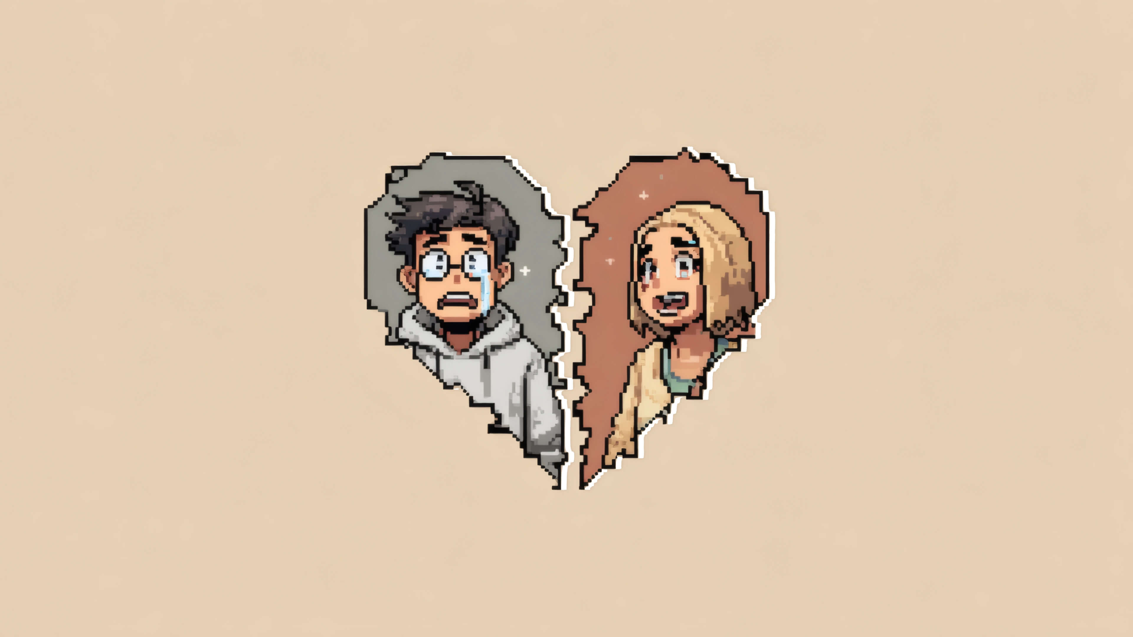 pixel art heartbreak, retro sad love, 8-bit breakup illustration, player one heartbreak, cartoon love gone wrong, hoodie heartbreak pixel, split heart game over, lost love sprite art, gamer breakup meme, sad aesthetic boy and girl