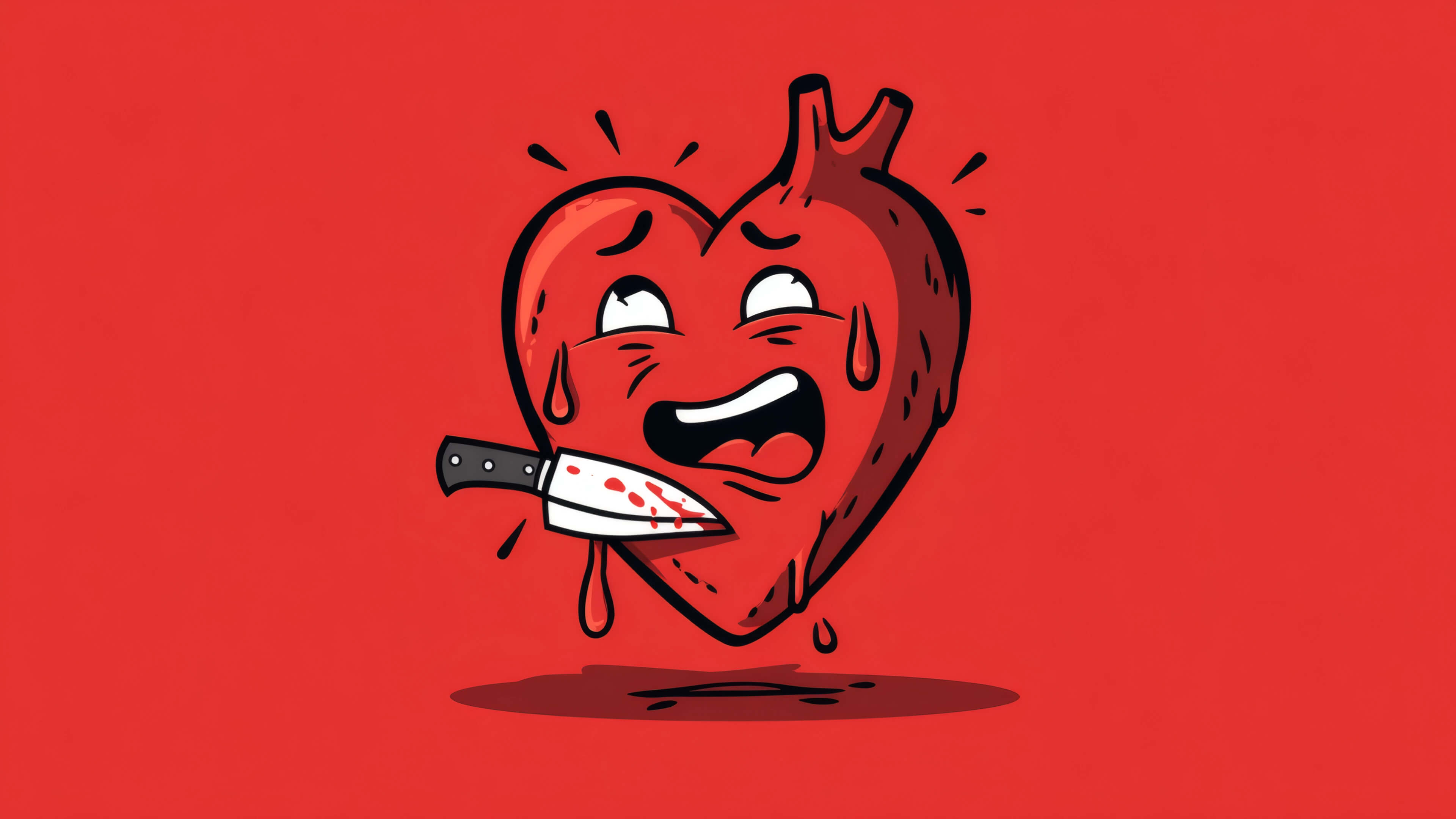 Cartoon-style red heart with a panicked face, crying and bleeding from a knife stuck in its side on a red background, representing humorous heartbreak.