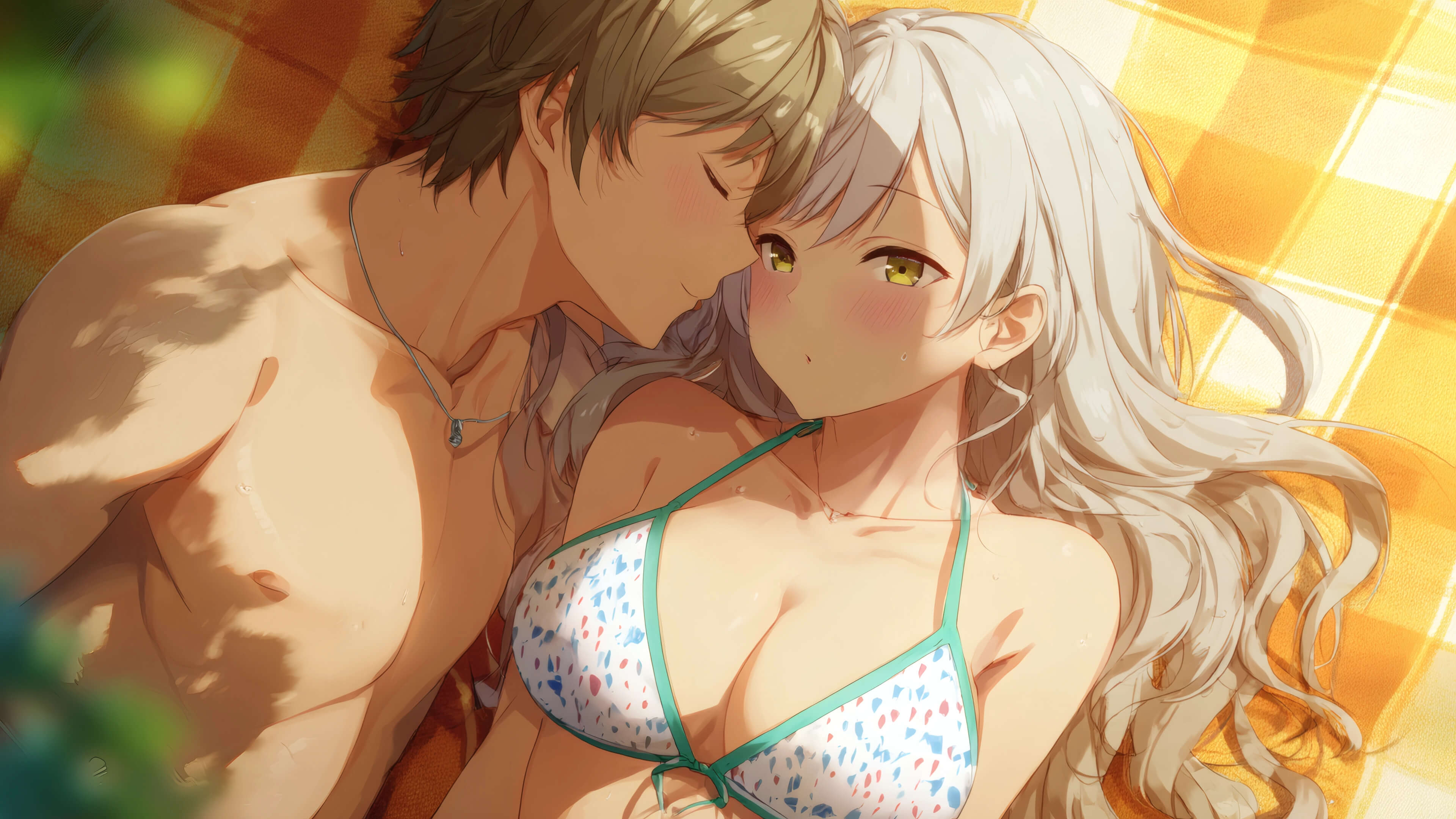 A tender anime moment unfolds on a golden checkered picnic blanket, where a shirtless guy leans in gently toward a blushing silver-haired girl in a colorful bikini. With soft sun-dappled lighting and sweat glistening from the summer heat, the two share an intimate gaze just moments away from a kiss. Their closeness is palpable, capturing the magic of young love under the warmth of the sun.