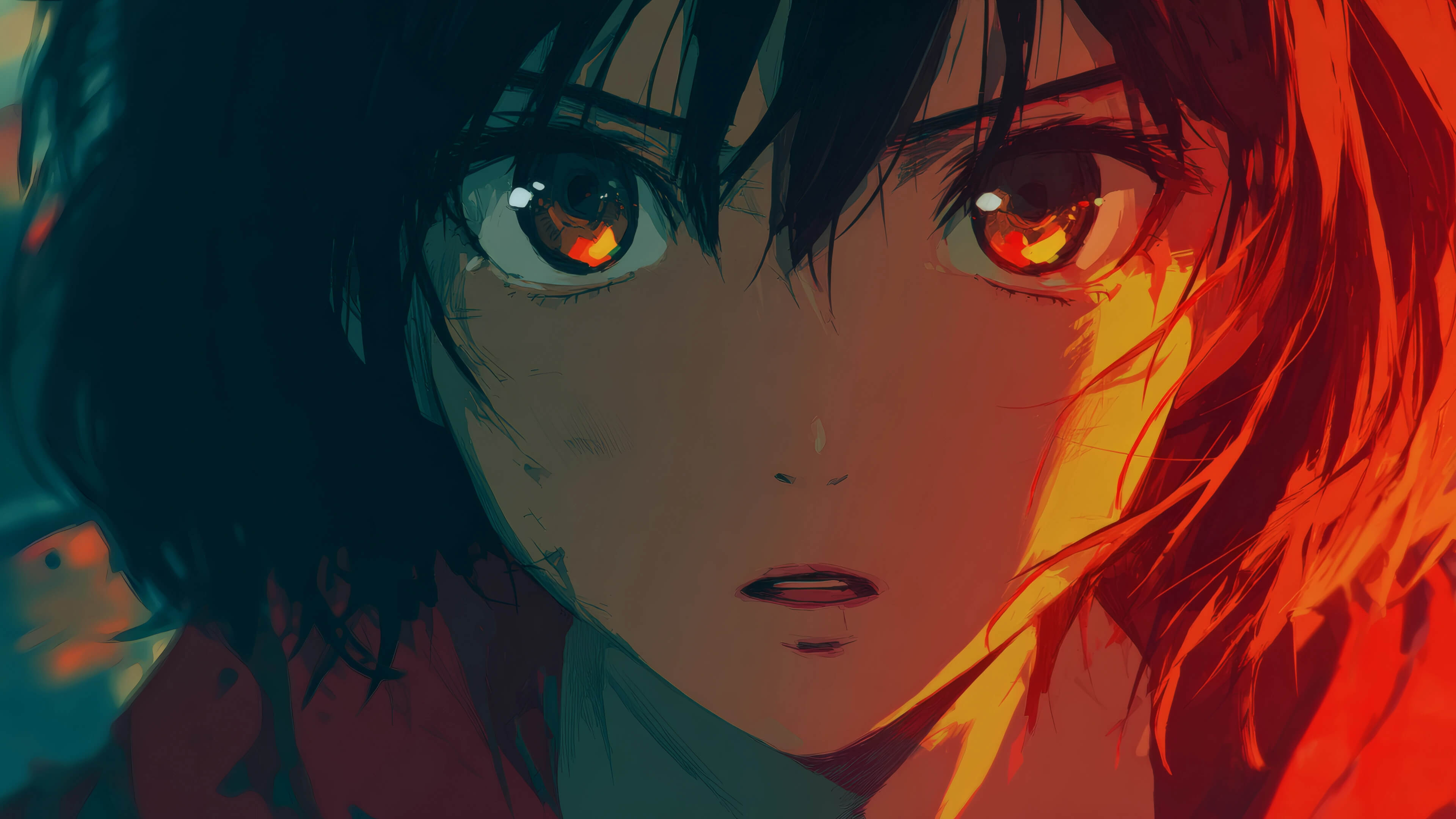 anime close-up, anime girl portrait, anime firelight, emotional anime art, dramatic anime illustration, intense anime eyes, anime heroine, anime digital painting, cinematic anime scene, high resolution anime art, Japanese animation style, anime wallpaper, anime character close-up, anime determination, anime artwork high quality