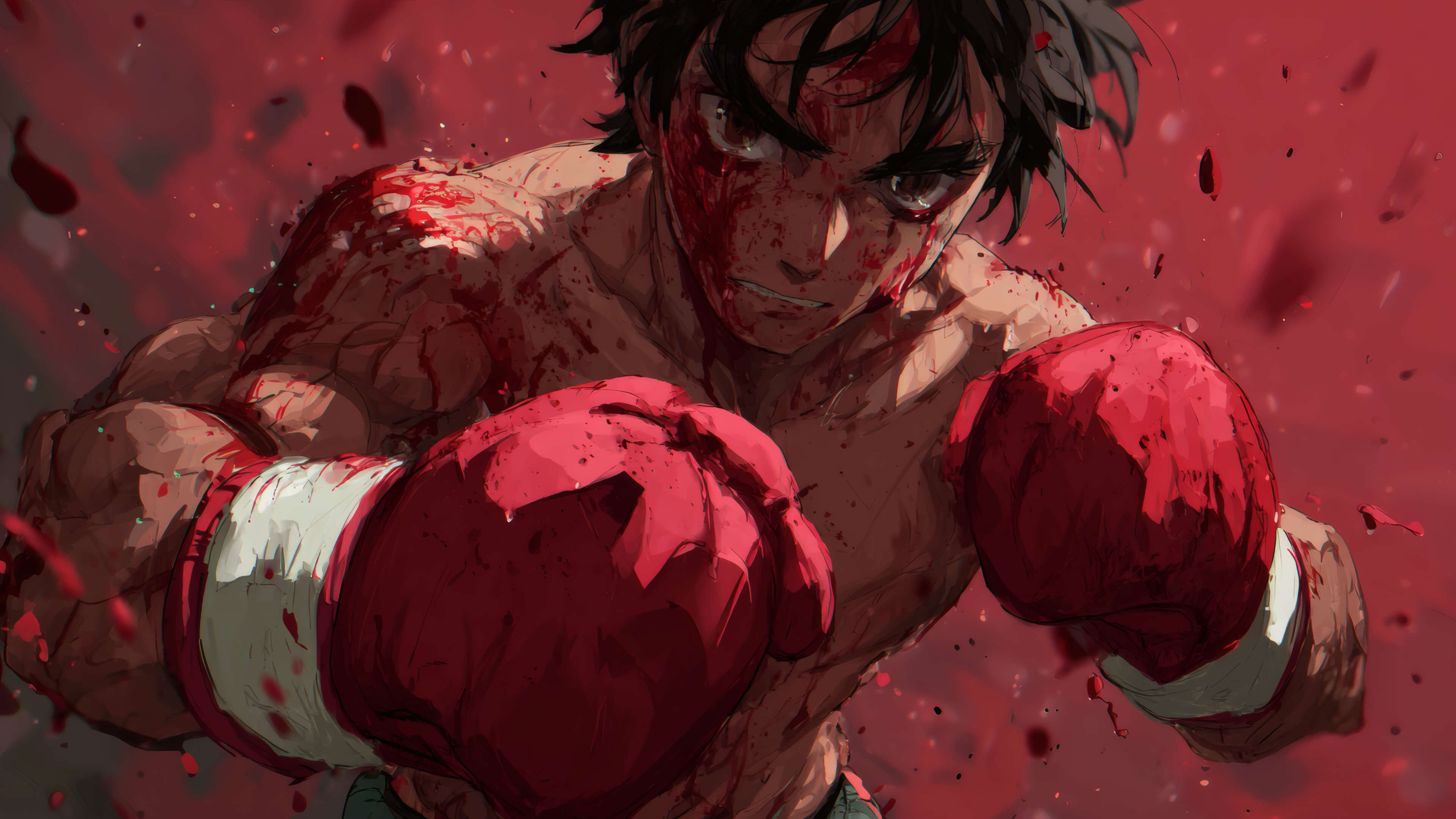 anime, boxing, fighter, red gloves, combat, blood, fight scene, determination, warrior, perseverance, anime boxing, intense, action, sports anime, male fighter, fighting spirit, grit, courage, pain and glory