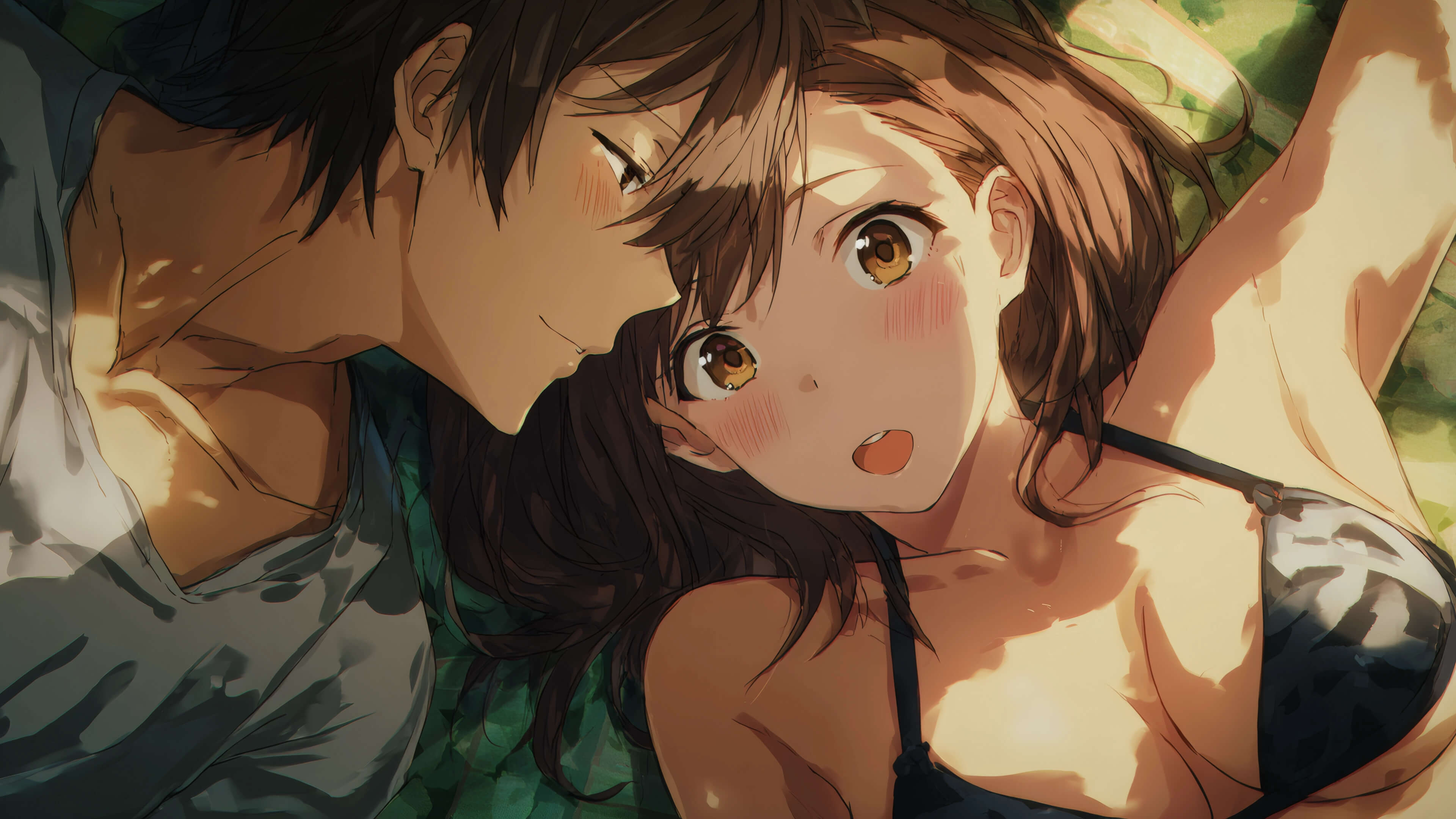 Anime couple lying on a green blanket under sunlight, the guy smiling as the surprised girl looks up at him, blushing in a bikini.