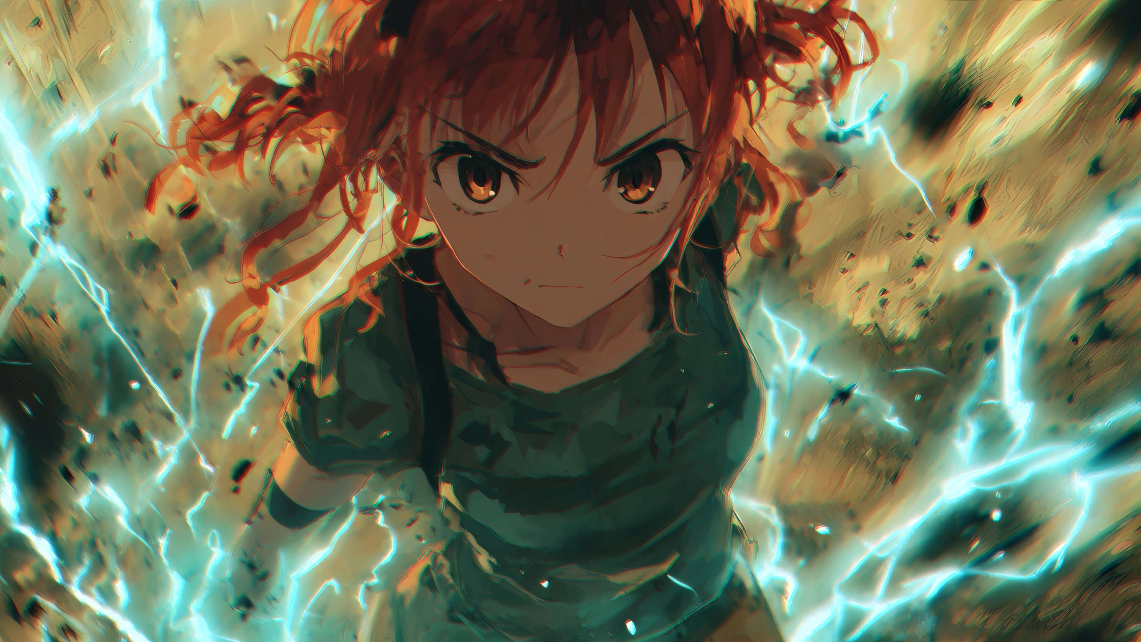anime superpower, electric energy, anime lightning, red-haired anime girl, anime action scene, anime battle, power surge, storm energy, girl with powers, anime voltage, electricity aura, intense anime wallpaper, fierce expression, supernatural anime, heroic anime character