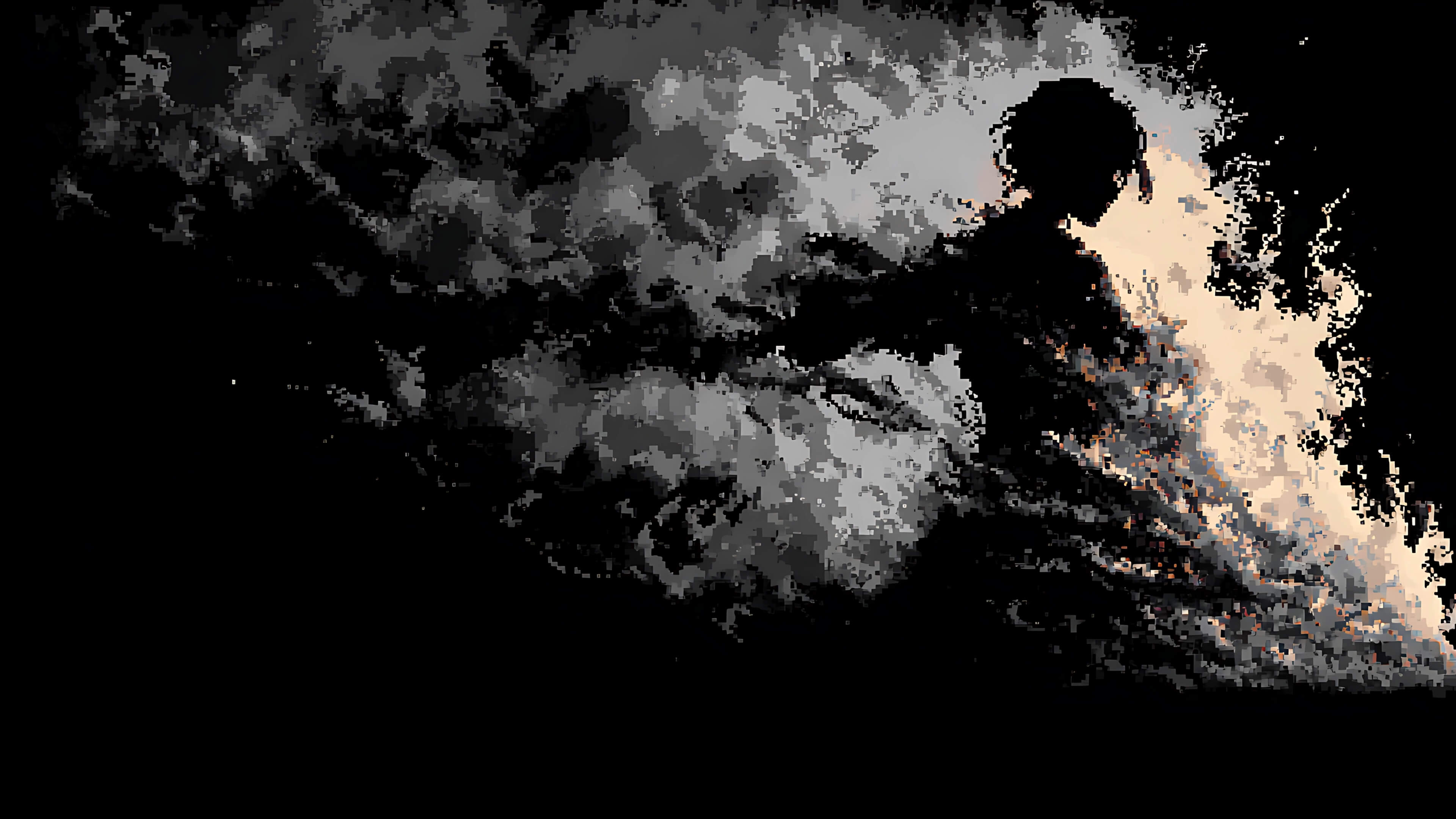 Pixel art of a ninja dissolving into dark smoke and light, creating a mysterious and cinematic disappearing effect.