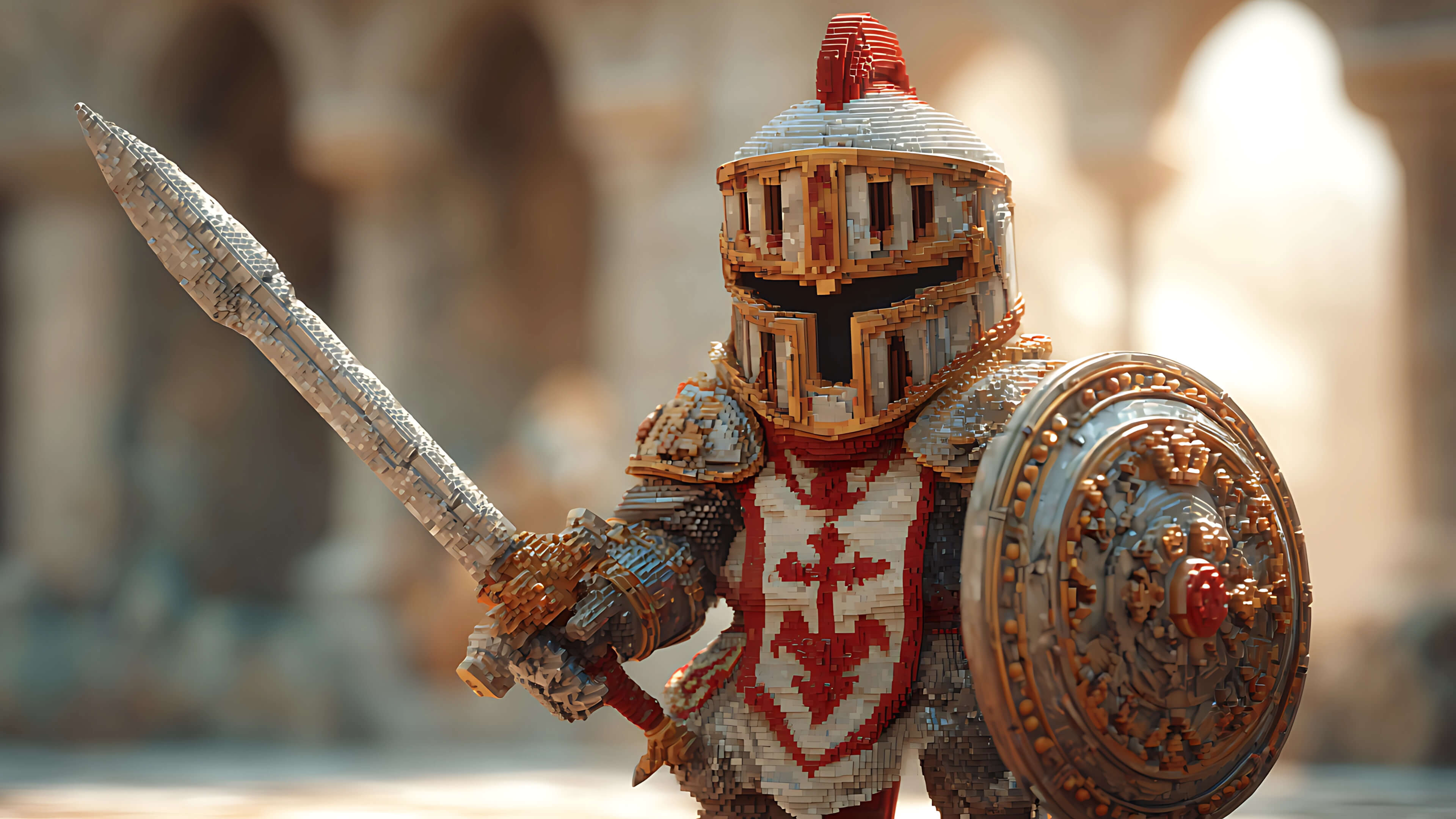 voxel art, paladin, crusader, armored knight, fantasy warrior, voxel character, medieval hero, sword and shield, divine warrior, retro 3D art, game asset, high-detail voxels, holy knight, fantasy illustration, heroic character