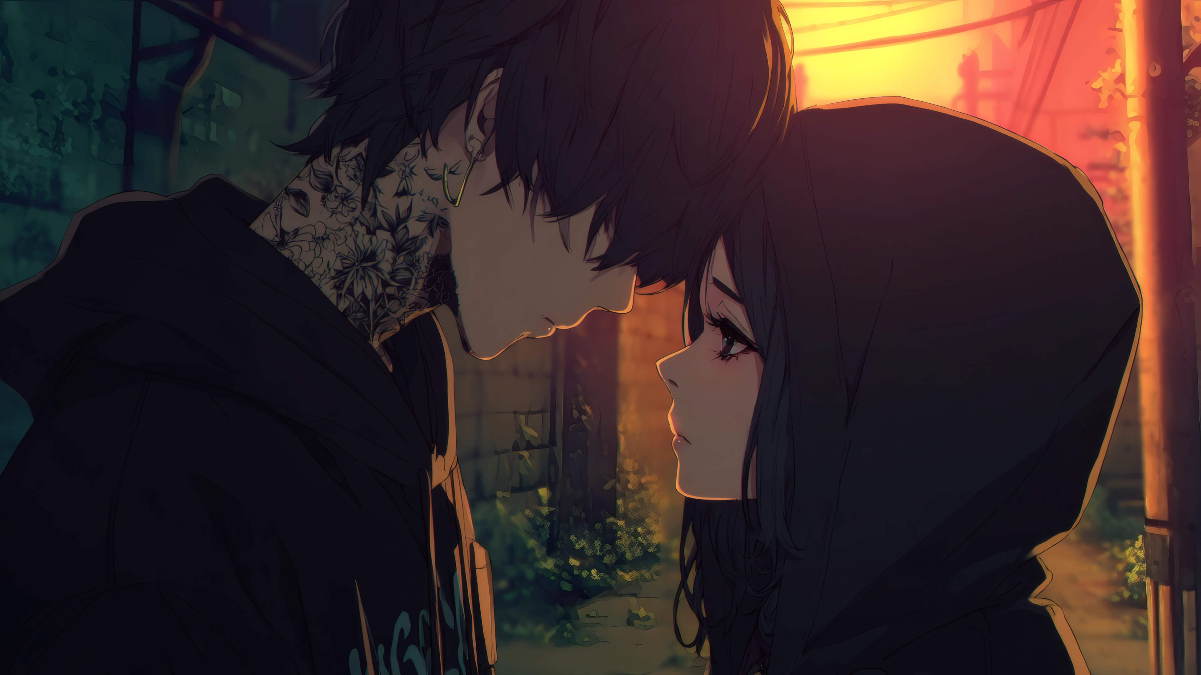 Tattooed anime boy and hooded girl standing forehead-to-forehead at sunset in an alley, sharing an intimate emotional moment.