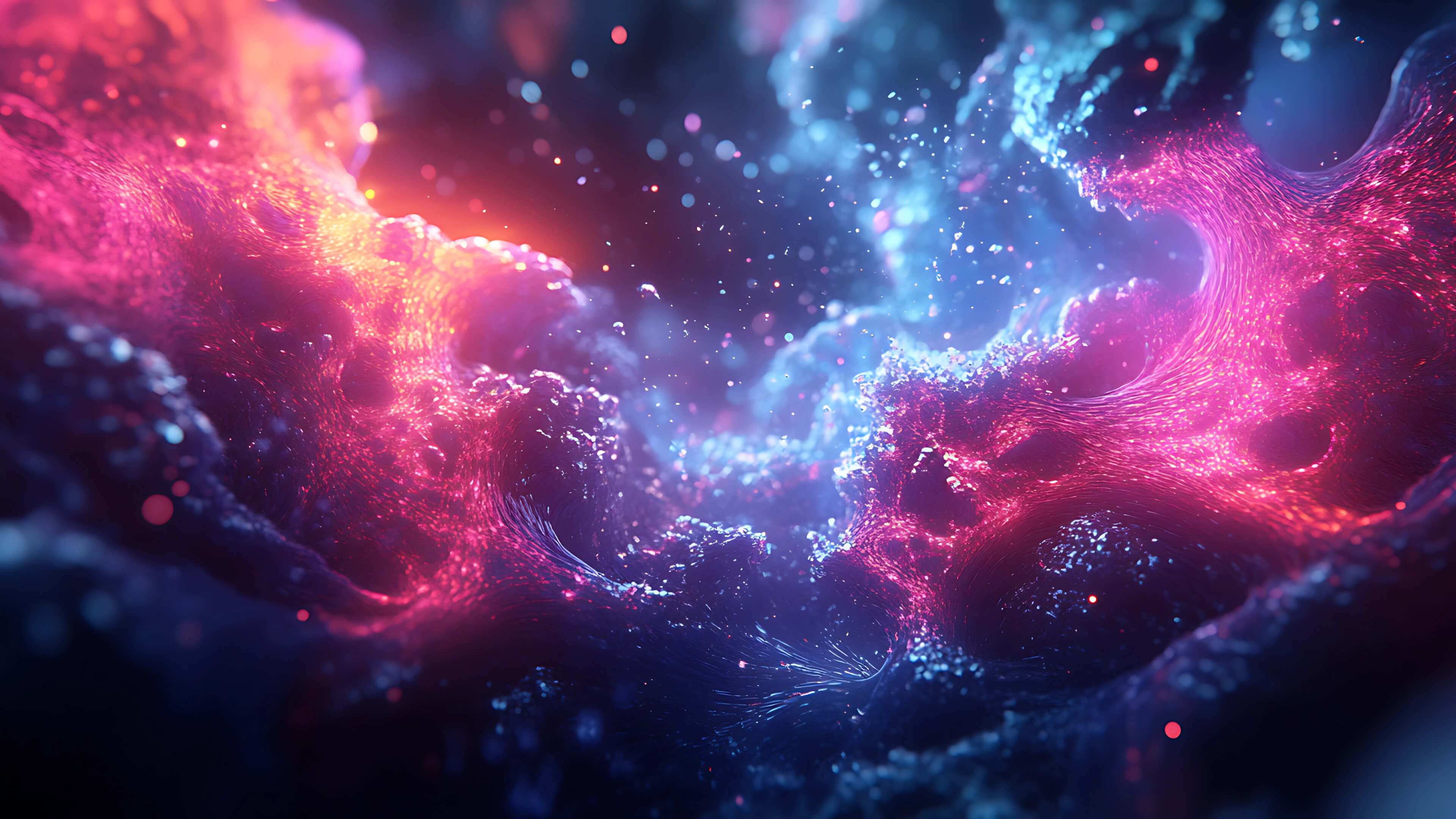 A mesmerizing 3D abstract scene where glowing waves of pink, purple, and blue energy swirl through a cosmic void. Particles of light drift like stardust across the scene, creating a sense of infinite motion and galactic beauty. The colors merge and pulse as if alive, evoking the birth of stars within a vibrant nebula.