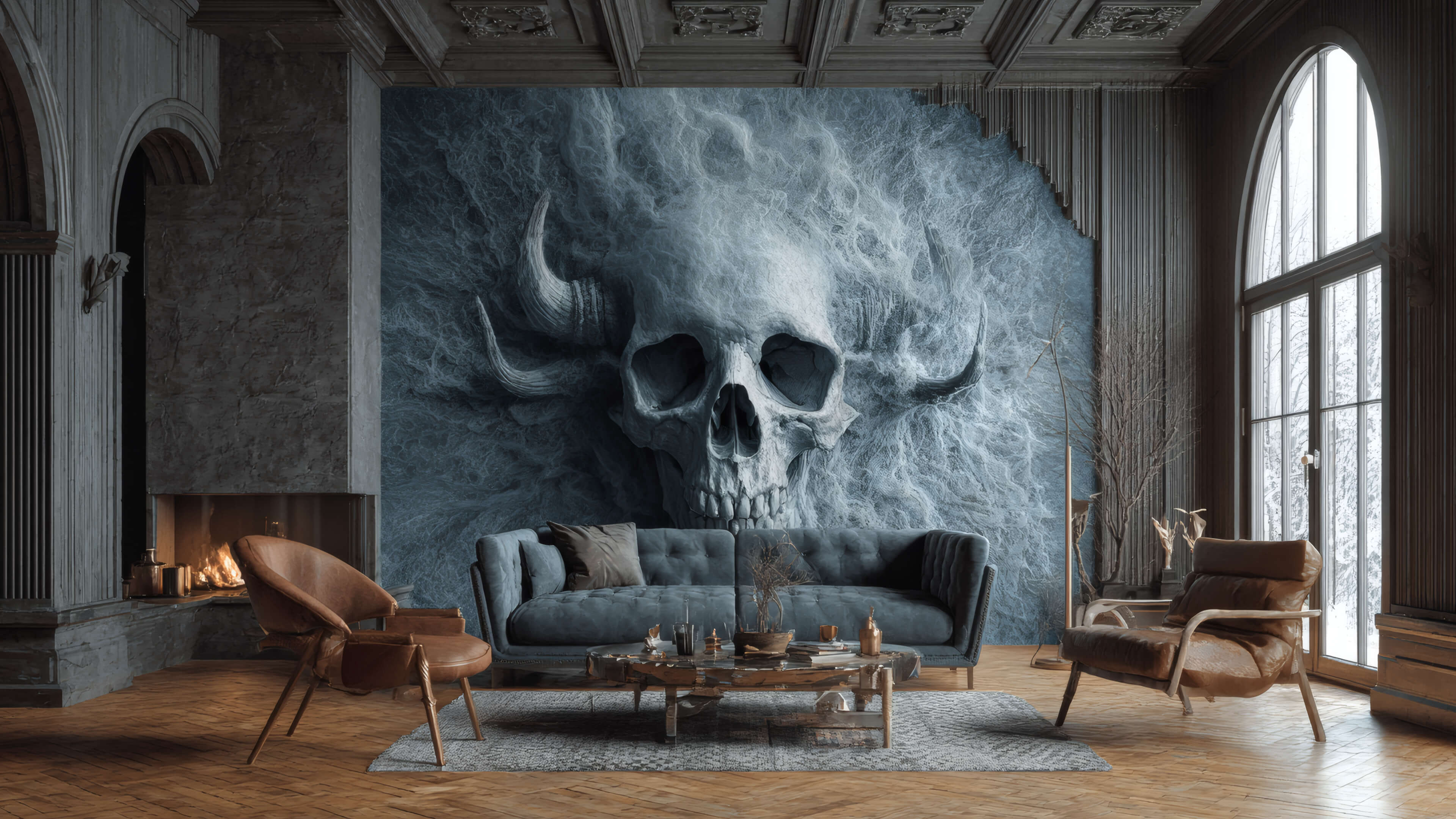 A lavish, vintage-style living room meets dark surrealism as a massive textured mural of a horned skull emerges from the wall like a frozen scream. The cozy fireplace and rich wood flooring contrast sharply with the ominous centerpiece, blending comfort and dread in one captivating space. Soft winter light pours in from arched windows, adding an ethereal glow to a scene that feels both luxurious and haunted.