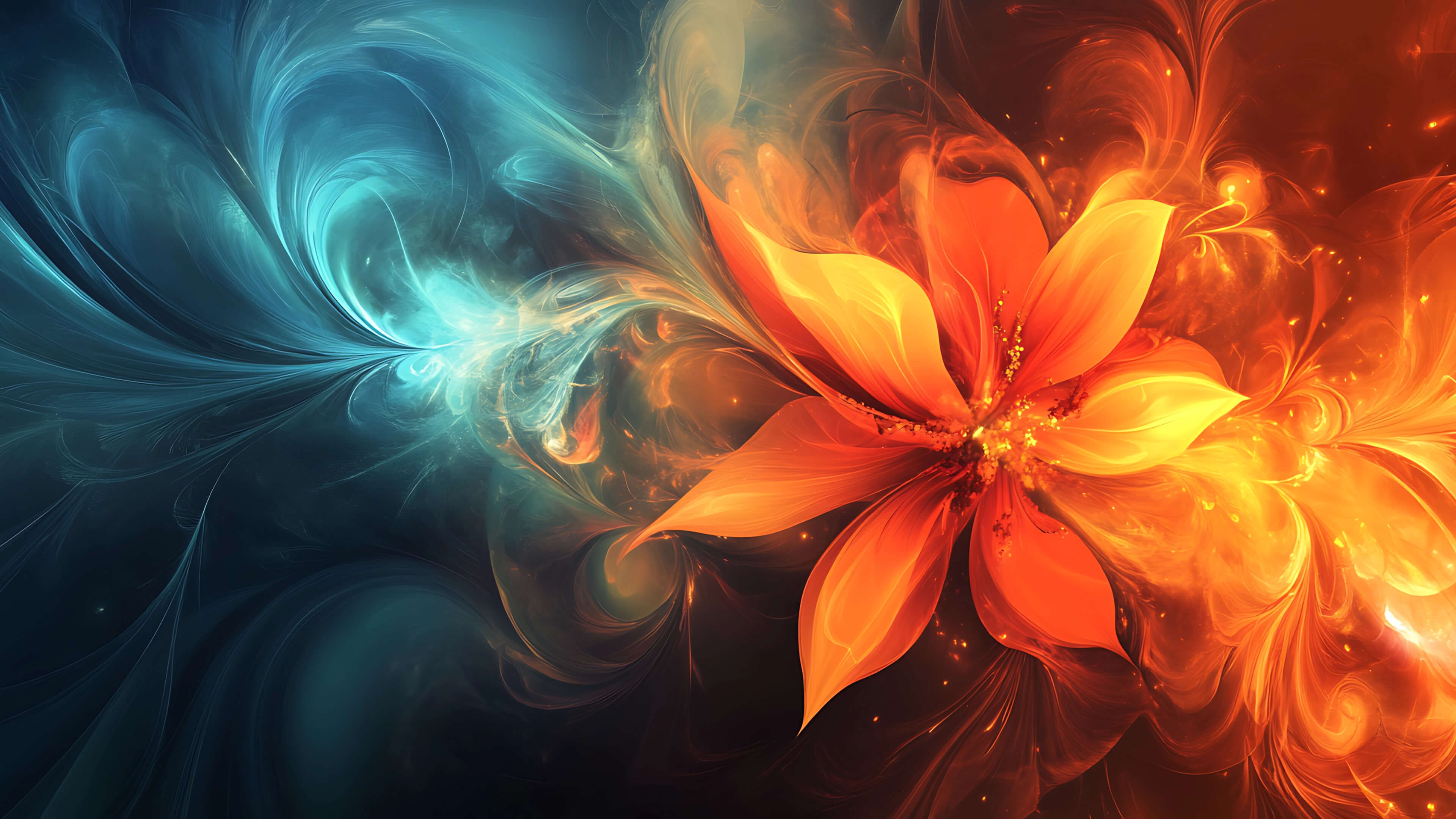 Digital artwork of an orange fiery flower blending with swirling blue frost, representing the balance between fire and ice in a vibrant abstract composition.