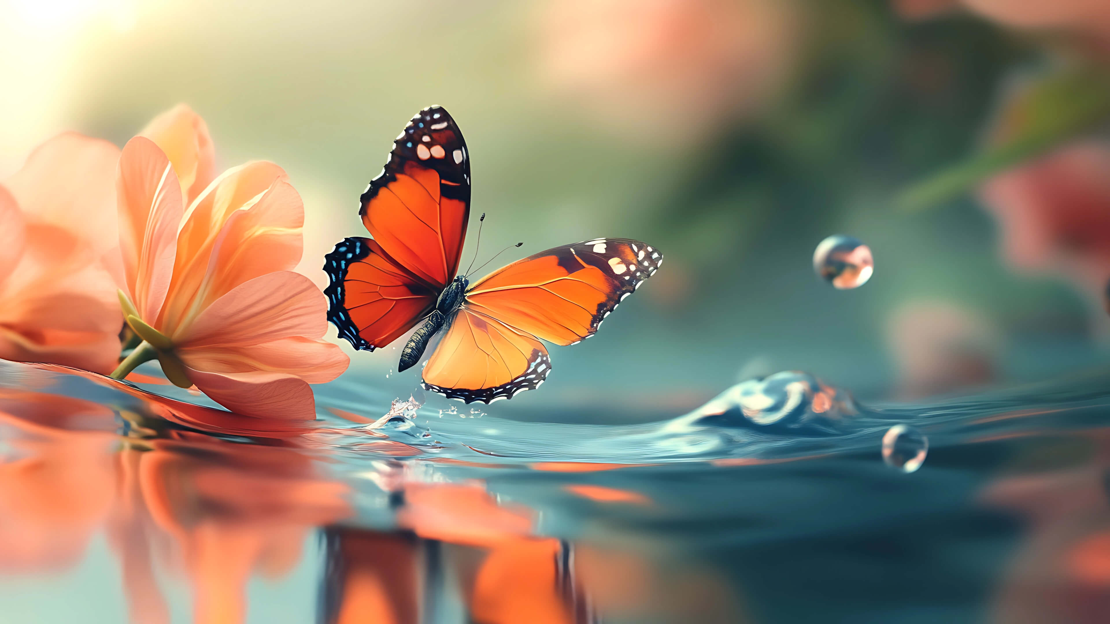 A delicate orange butterfly hovers gracefully above rippling water beside soft peach flowers. The sunlight glows gently through the petals, creating a peaceful, dreamlike scene that captures the essence of calm, renewal, and fleeting beauty.