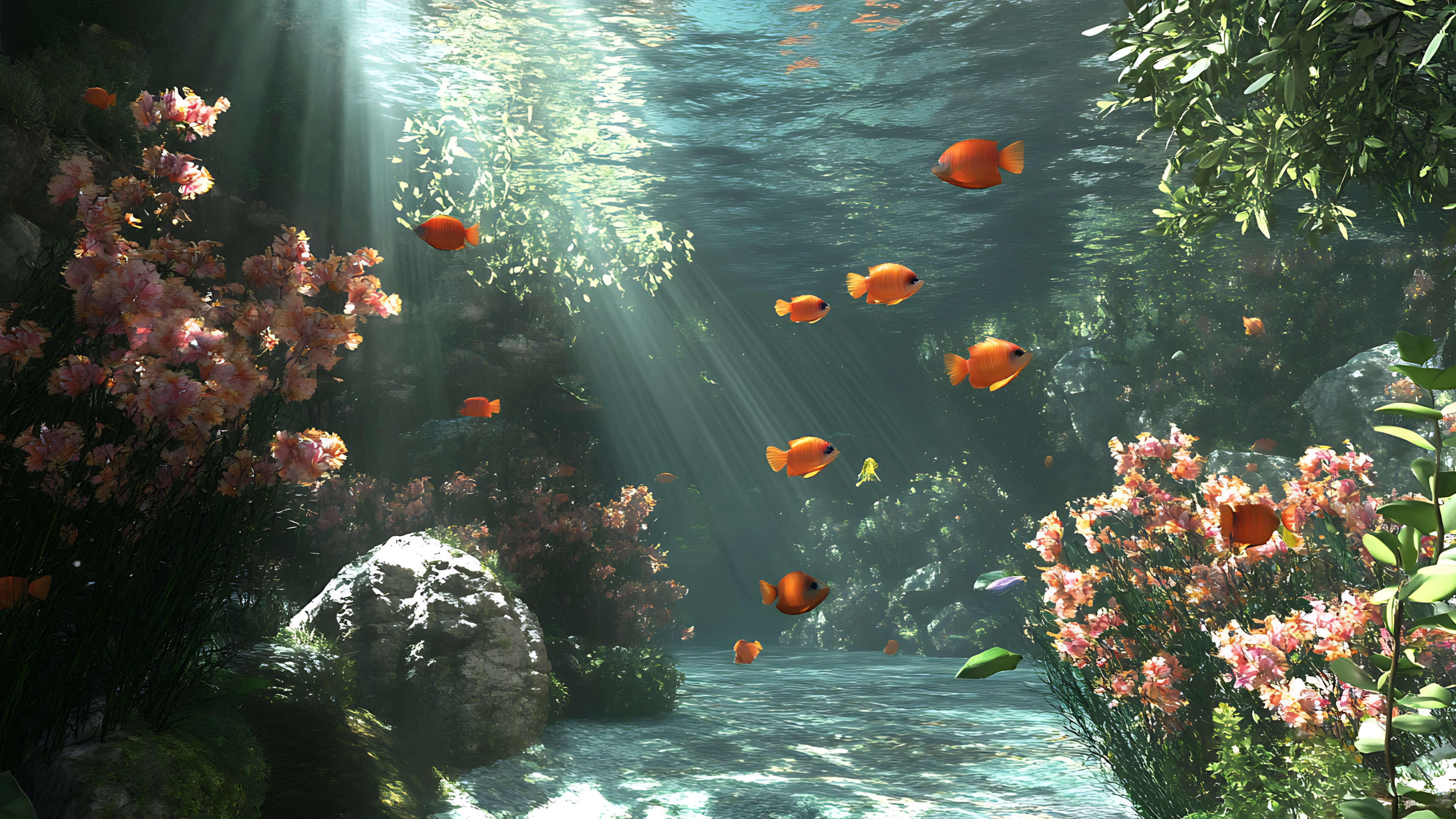 A serene 3D underwater paradise filled with radiant orange fish swimming through beams of sunlight. Colorful coral-like flowers and lush greenery sway gently in the current, creating a tranquil and dreamlike aquatic scene that feels both alive and peaceful.