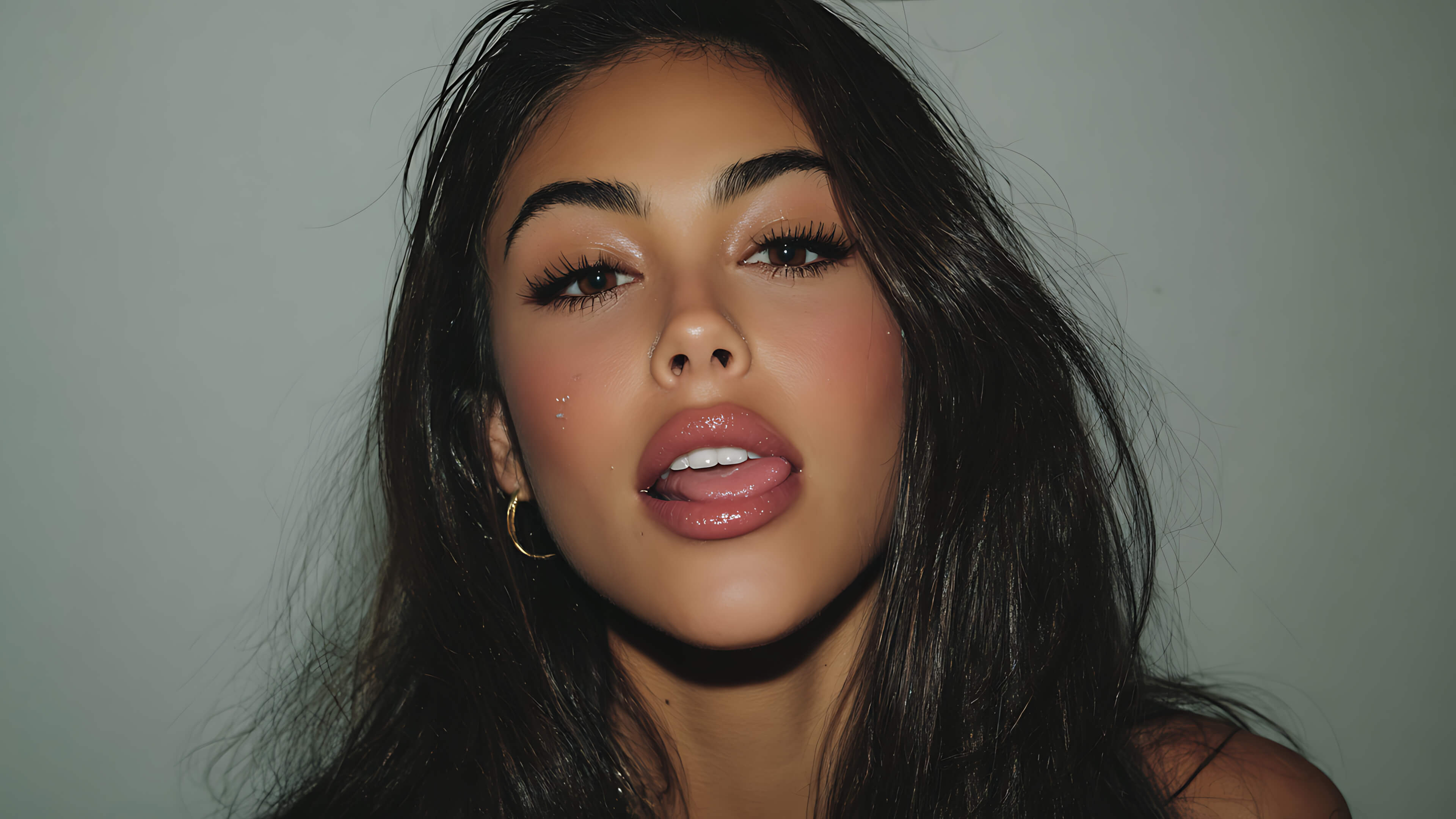 A close-up portrait of a woman with long dark hair, dewy skin, and glossy lips, playfully sticking her tongue out slightly. Her confident expression, flawless makeup, and gold hoop earring create a bold and modern aesthetic. The lighting highlights her natural features against a simple gray backdrop, emphasizing the raw allure and editorial vibe.