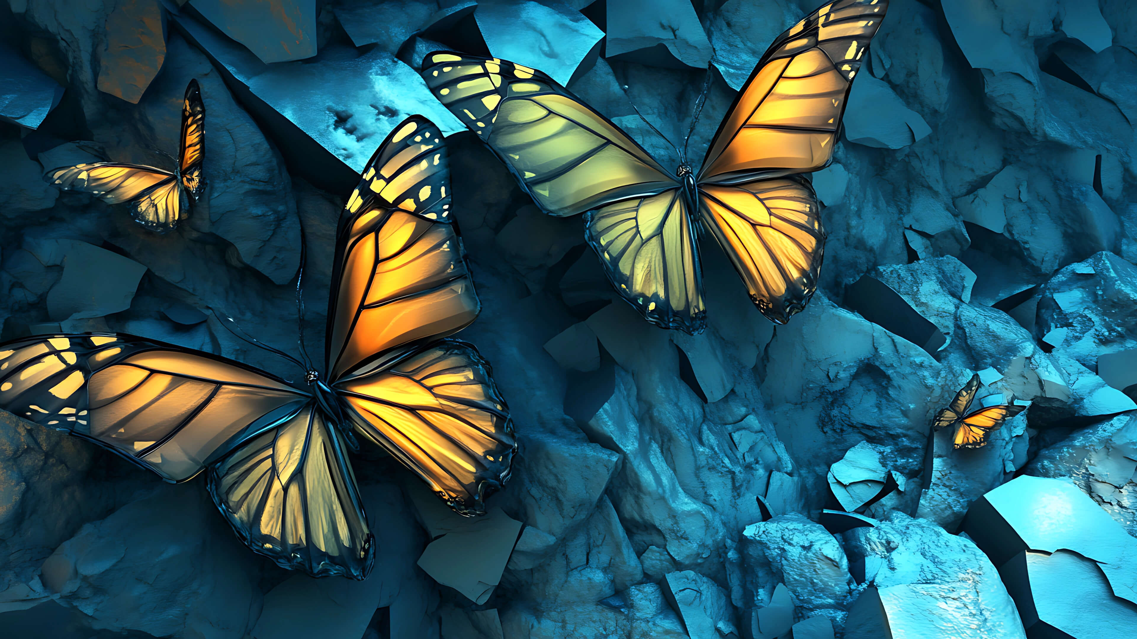 A striking 3D digital artwork of glowing golden butterflies resting on cool blue rock textures. The contrast between the radiant orange wings and the icy blue environment creates a mesmerizing balance of warmth and tranquility, symbolizing life thriving even in the coldest places.