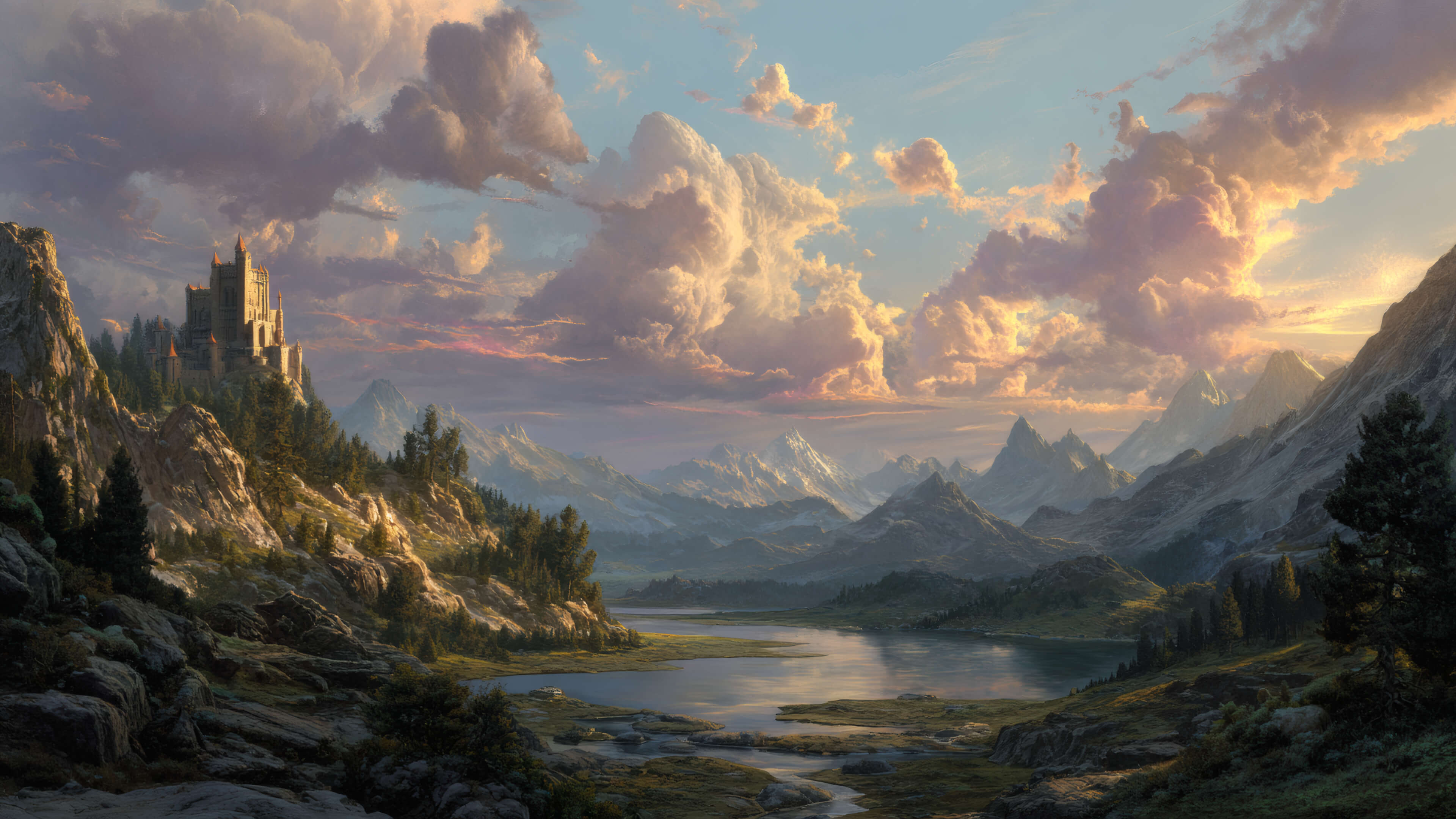 A breathtaking fantasy vista unfolds as a grand castle rises from the cliffs overlooking a shimmering valley lake. Towering snow-capped mountains loom in the distance beneath a sky painted with golden sunlight and dramatic pastel clouds. The scene radiates timeless beauty, evoking tales of ancient kingdoms, royal bloodlines, and quiet magic whispered through mountain winds.