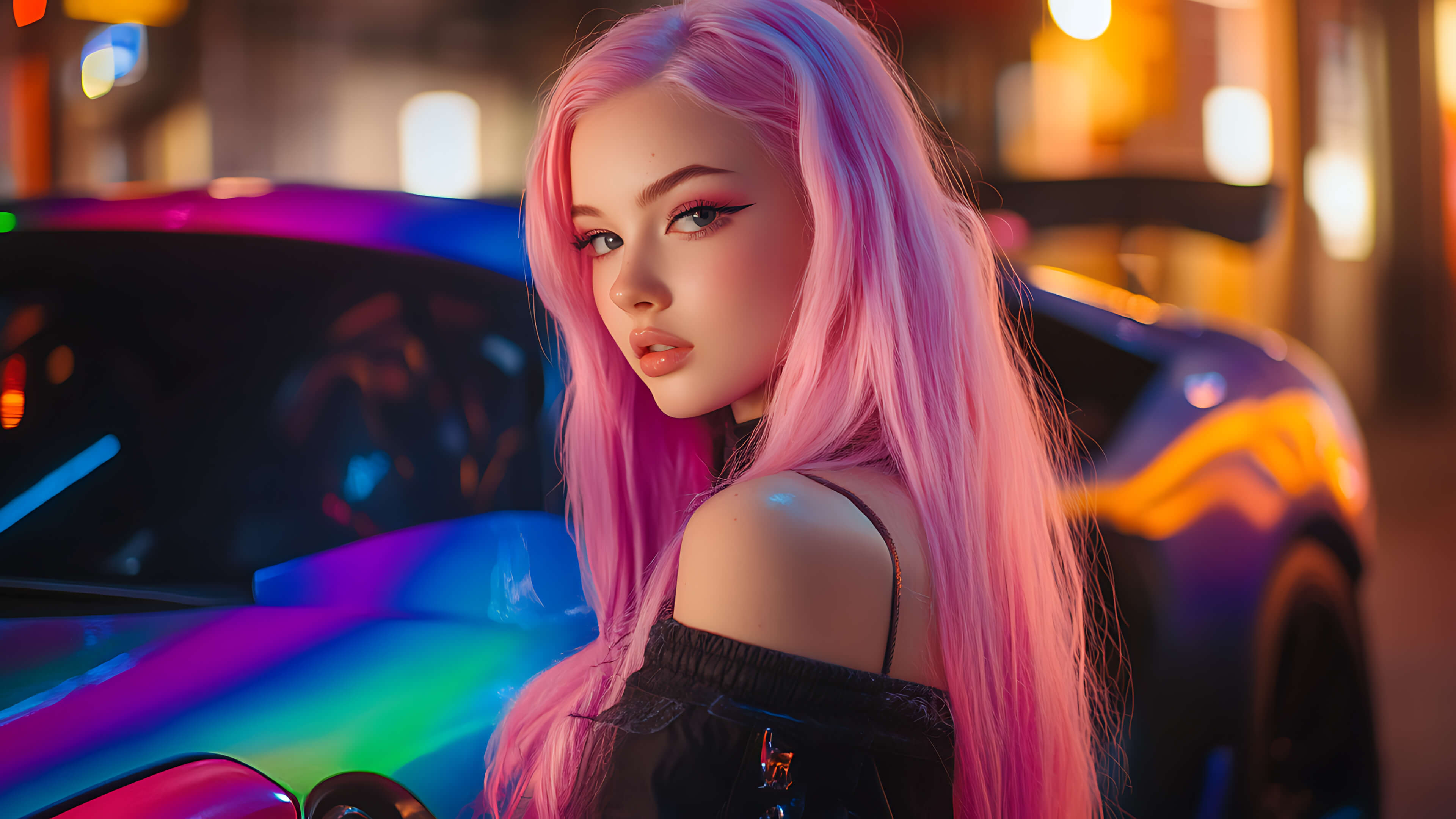 A stunning young woman with silky pastel pink hair and flawless makeup stands confidently beside a hyper-colorful, rainbow-painted luxury car. Shot under glowing city lights, her off-shoulder black outfit and sharp cat-eye eyeliner give her a doll-like, cyber-chic vibe. The reflections of vibrant neon across the vehicle's curves create a surreal, futuristic ambiance — blending fashion, nightlife, and pop fantasy into a striking visual statement.