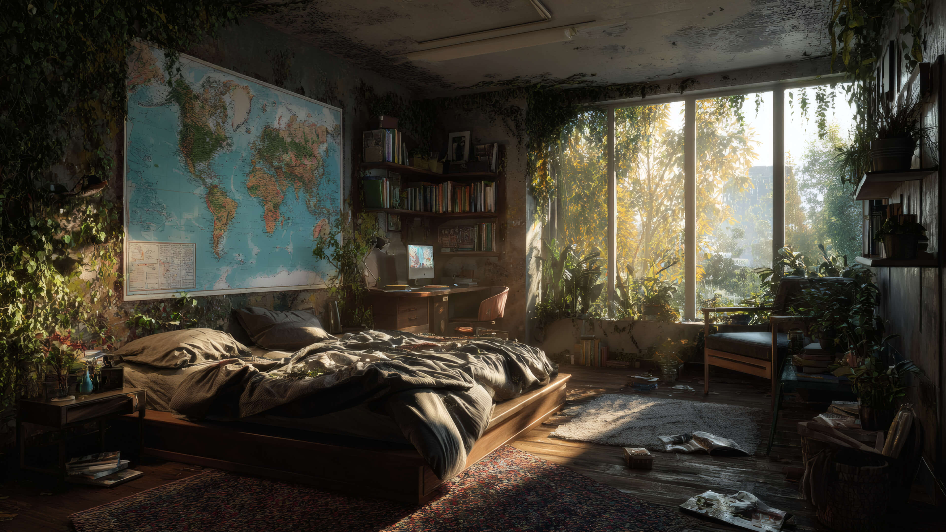 A beautifully detailed, realistic bedroom overtaken by nature. Sunlight filters through tall windows, illuminating lush plants draping from the ceiling and crawling along the walls. A large world map hangs above an unmade bed, hinting at a curious and wandering soul. Books and scattered magazines cover the floor and furniture, while a wooden desk and shelves add a scholarly charm. It’s a quiet blend of chaos and calm - a hidden refuge for dreamers, thinkers, and artists alike.