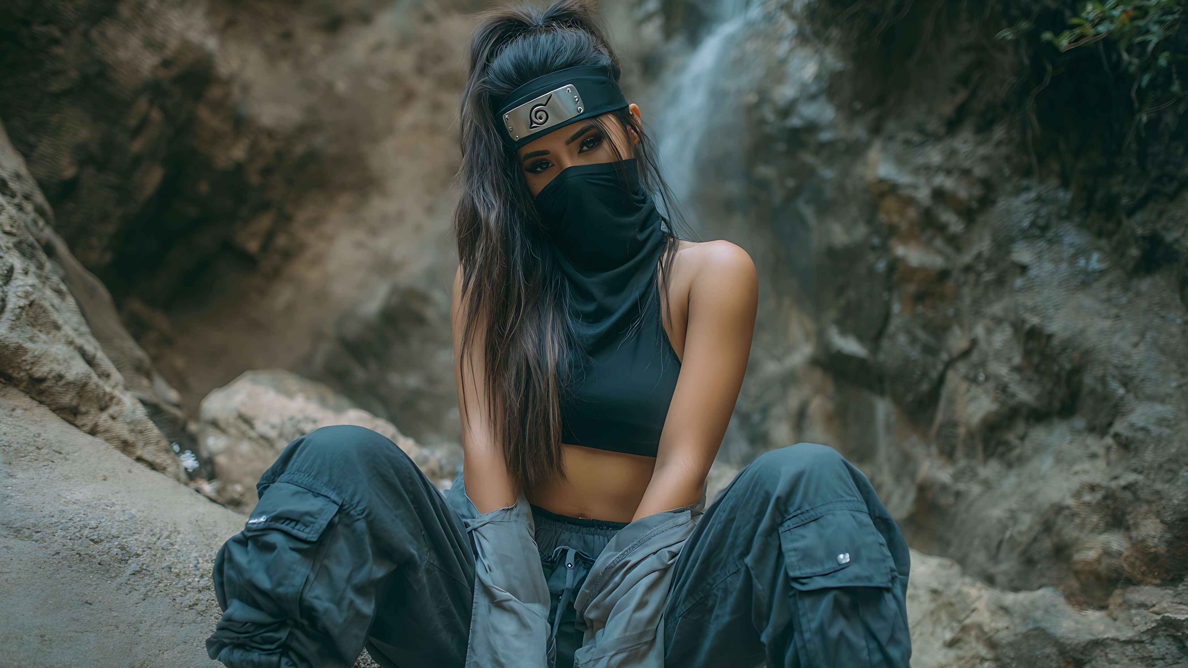 A fierce young woman dressed in ninja-inspired streetwear sits confidently in a rocky, natural setting. She wears a black crop top, baggy cargo pants, and a face covering, complete with a Leaf Village headband from Naruto. Her long hair is tied up in a high ponytail, and her intense gaze pierces through the mask, channeling major shinobi energy.