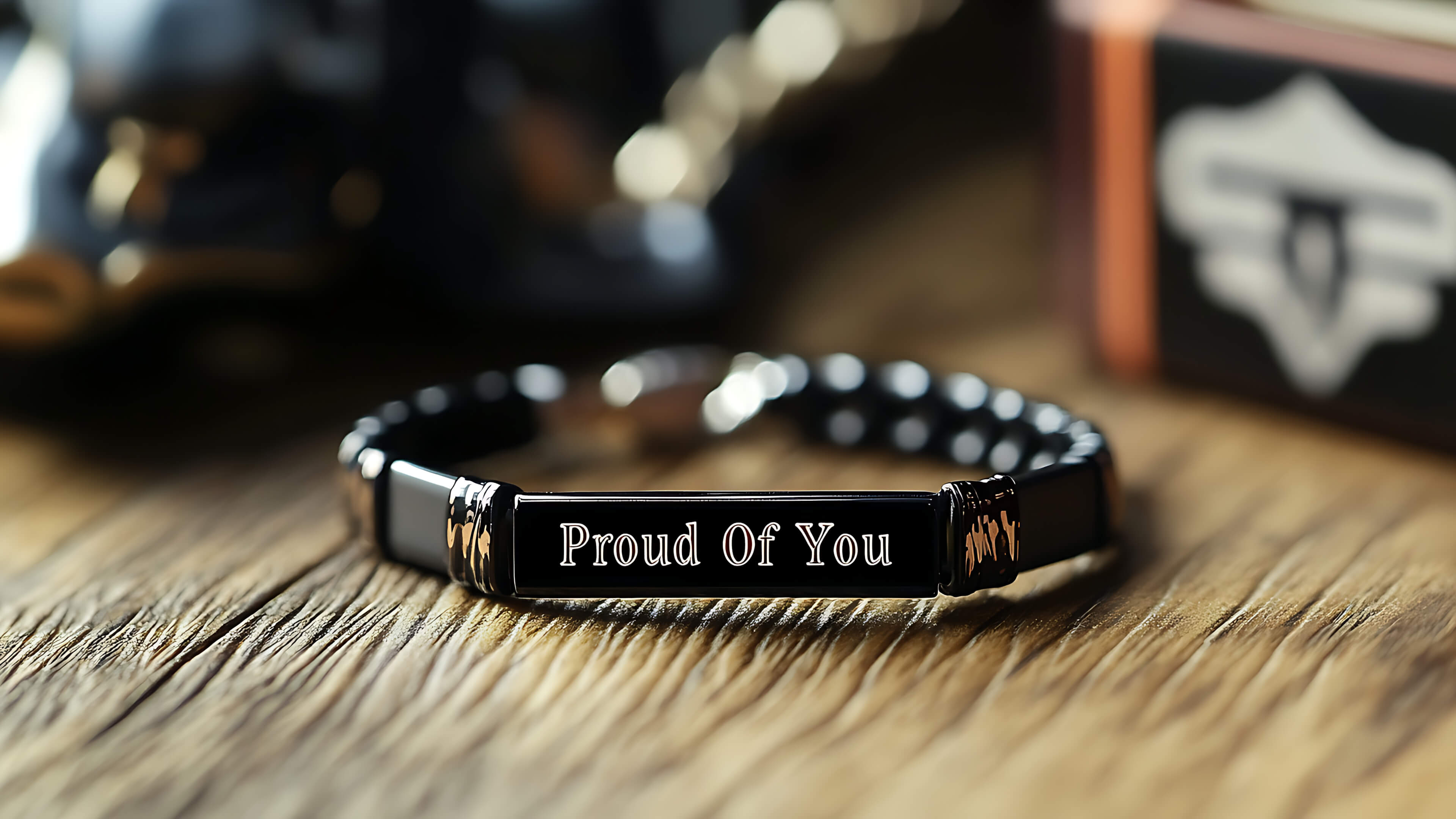 A beautifully detailed close-up of a sleek black bracelet resting on a wooden surface, engraved with the words “Proud Of You.” The bracelet’s metallic finish reflects the soft ambient light, hinting at sentimentality and elegance. It's more than an accessory - it's a quiet reminder of faith in someone's journey, strength, or growth. The background features subtle elements, creating a warm and masculine tone.