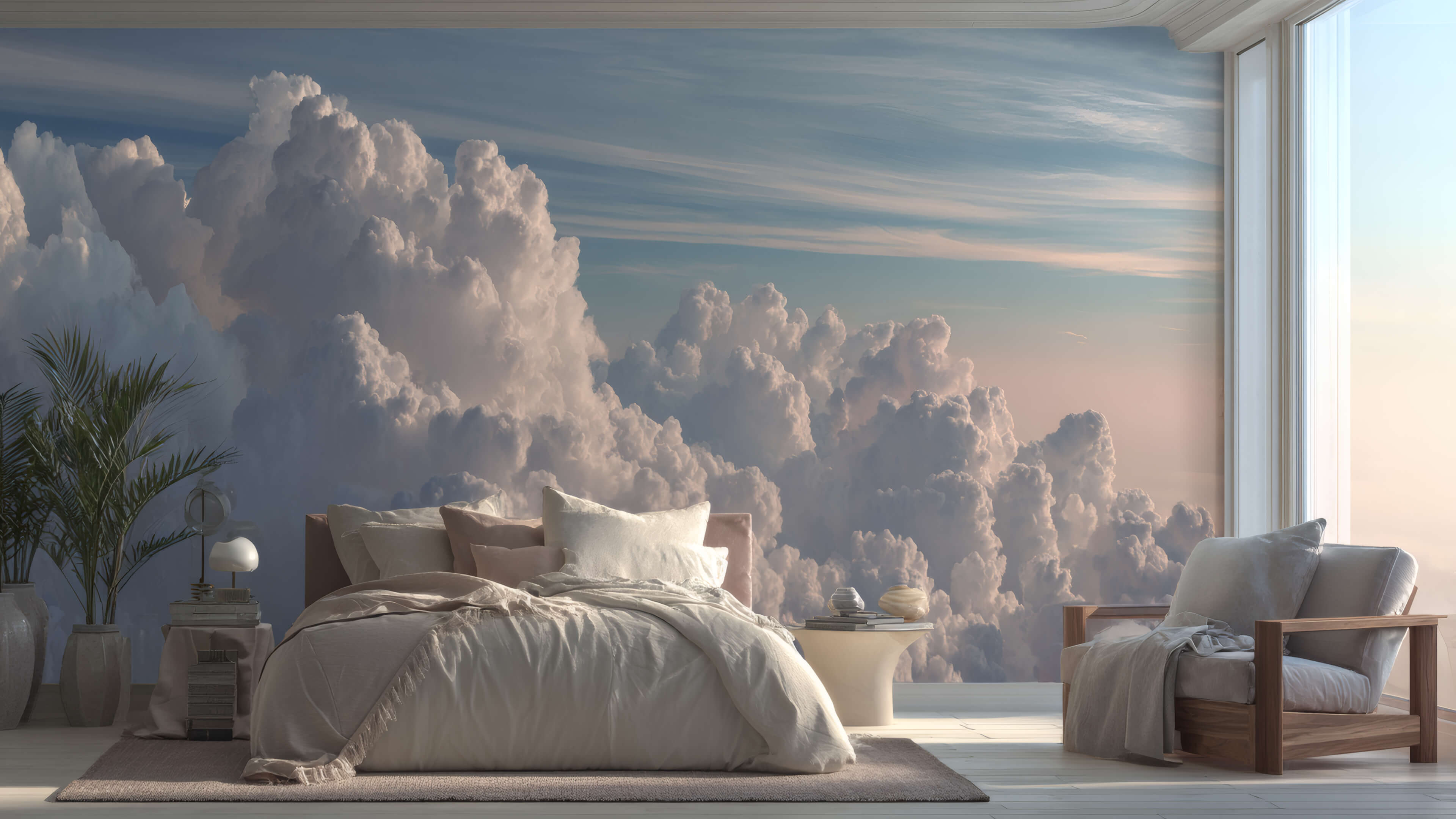 A tranquil, light-filled bedroom features a dreamy wall mural of towering cumulus clouds at golden hour, giving the illusion of resting above the heavens. Neutral-toned bedding and soft blush pillows rest atop a minimal bed frame, with natural textures and gentle daylight completing the look. The space evokes a perfect sense of weightlessness - peaceful, airy, and deeply restorative.