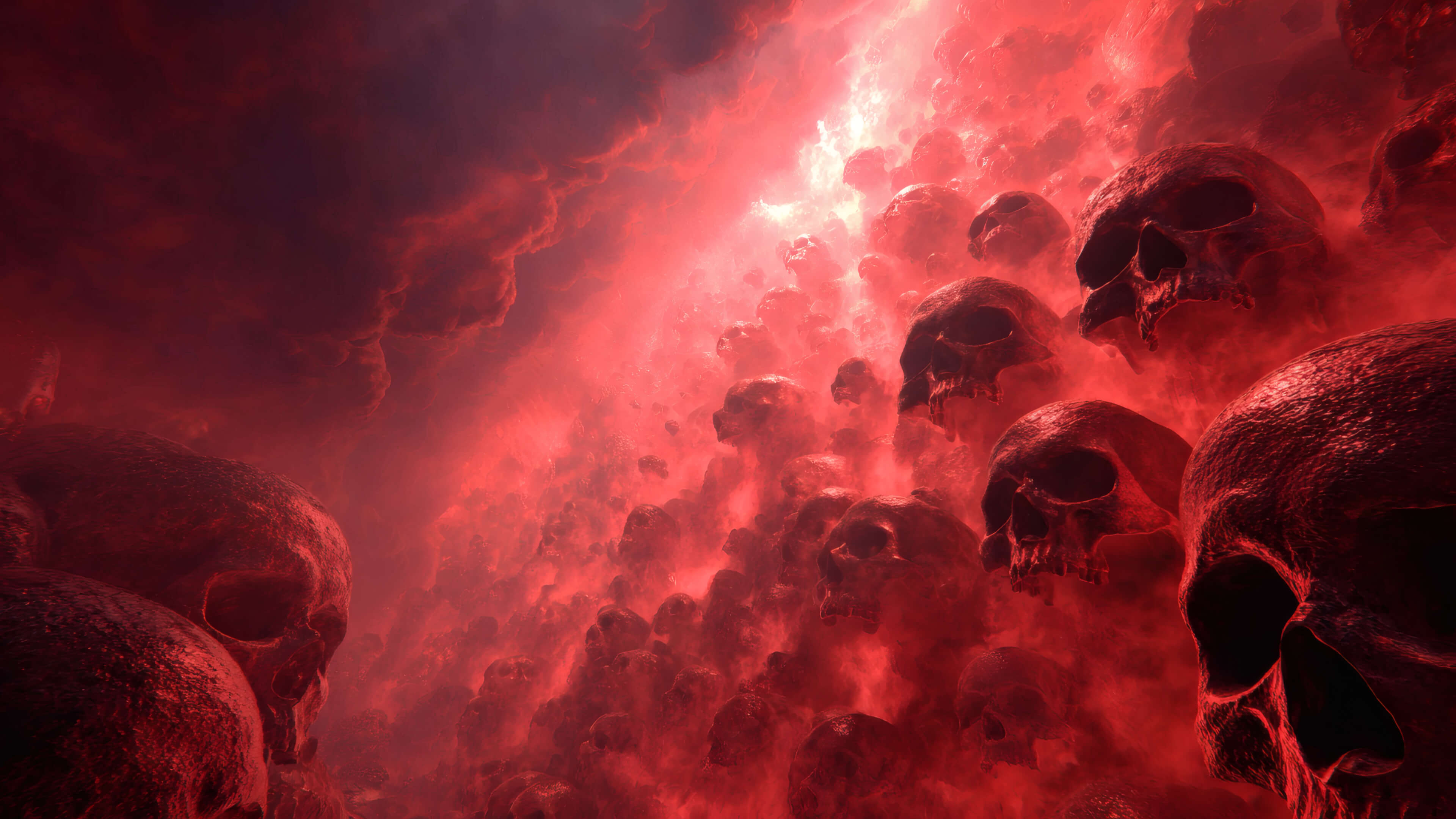 A terrifying current of countless charred skulls flows through a crimson storm, as if cascading through a dimensional rift in hell itself. The blood-red mist and the oppressive, churning clouds give the impression of eternal torment and souls caught in an endless tide of judgment. The scene pulses with heat, anguish, and the overwhelming presence of lost humanity - each skull a symbol of a story ended in fire and fury.
