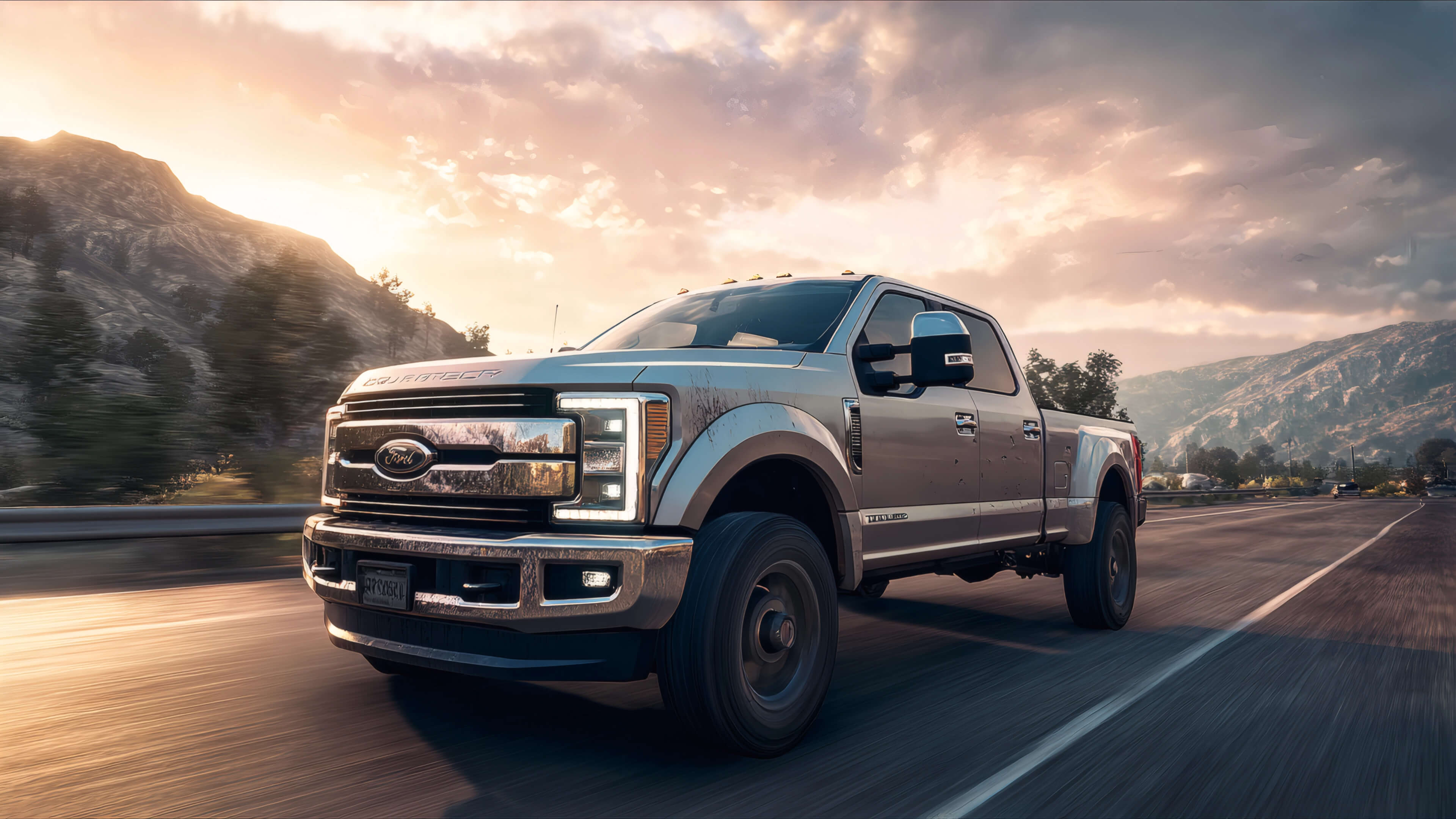 A powerful heavy-duty pickup truck driving along a scenic mountain highway at sunset. The truck’s chrome grille and rugged tires reflect strength and adventure, while the warm evening light enhances the dramatic sky and road motion.
