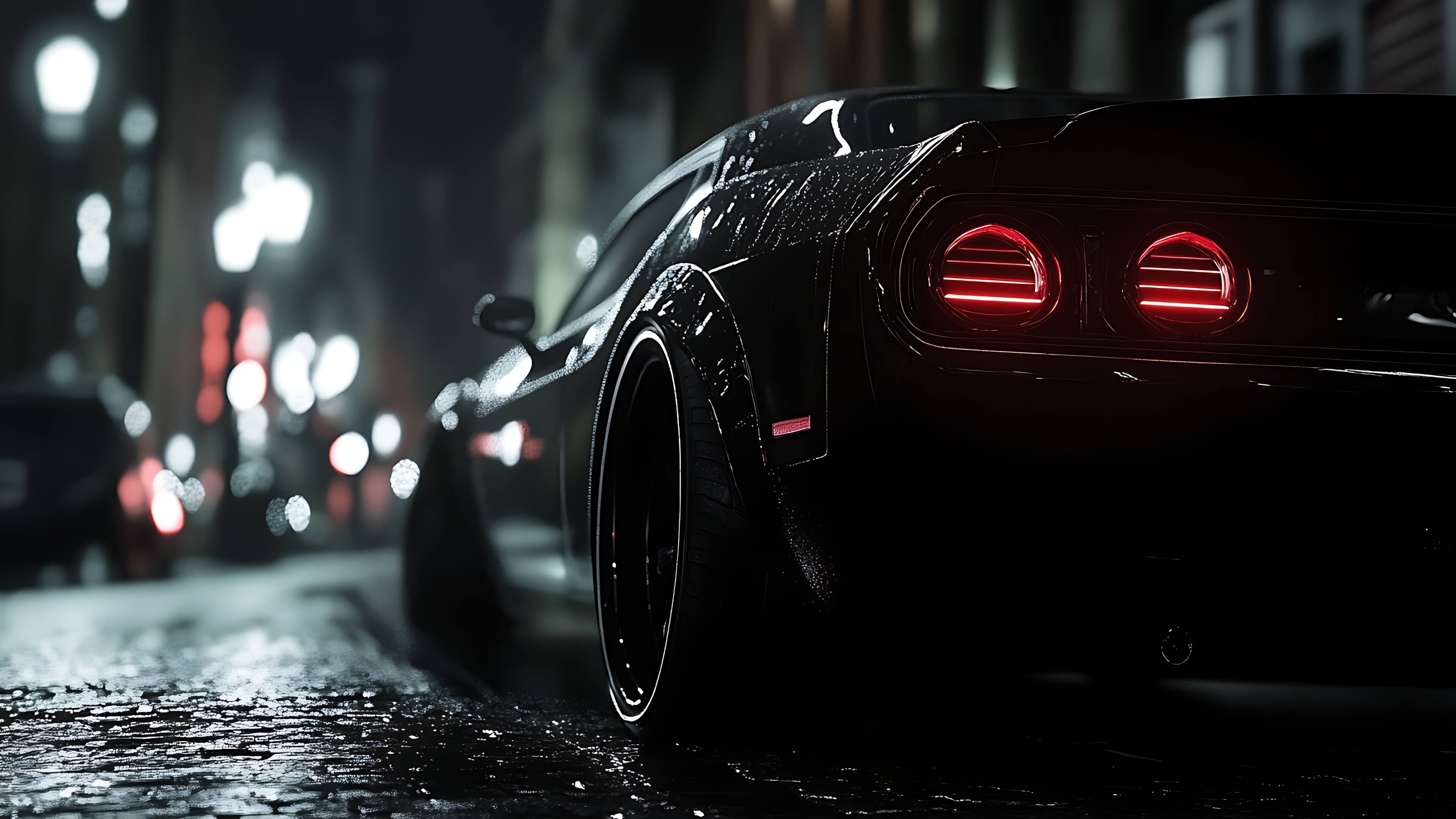 A sleek black muscle car is parked on a glistening cobblestone street under the dim glow of city streetlights. The scene is soaked in nighttime ambiance, with red taillights glowing intensely and reflections dancing across the wet pavement. The blurred urban background and bokeh lighting create a cinematic, moody atmosphere that screams danger and mystery. This car doesn’t just drive - it prowls.