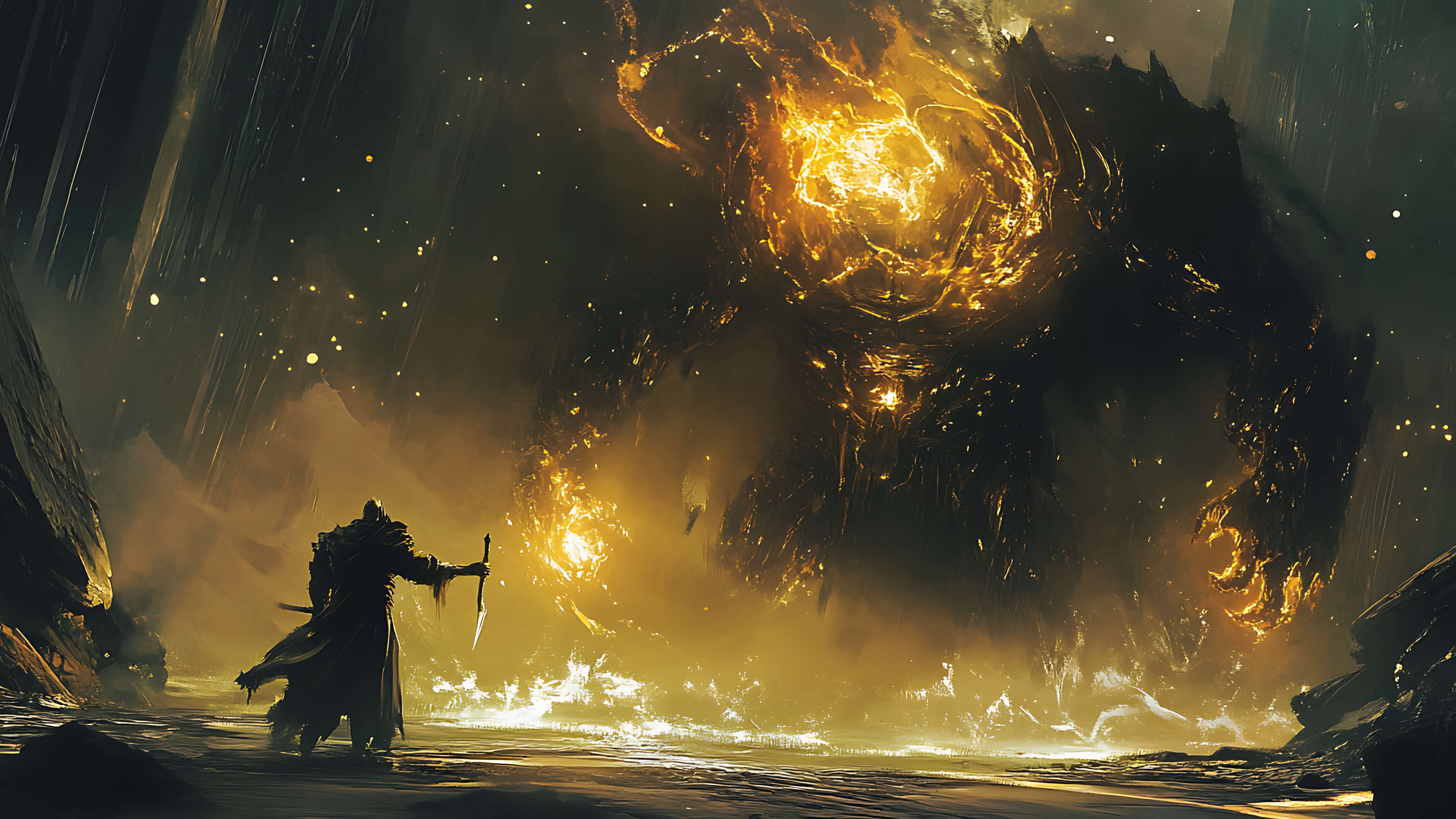 Dark fantasy digital art of a warrior facing a massive glowing shadow creature in a golden misty cavern.