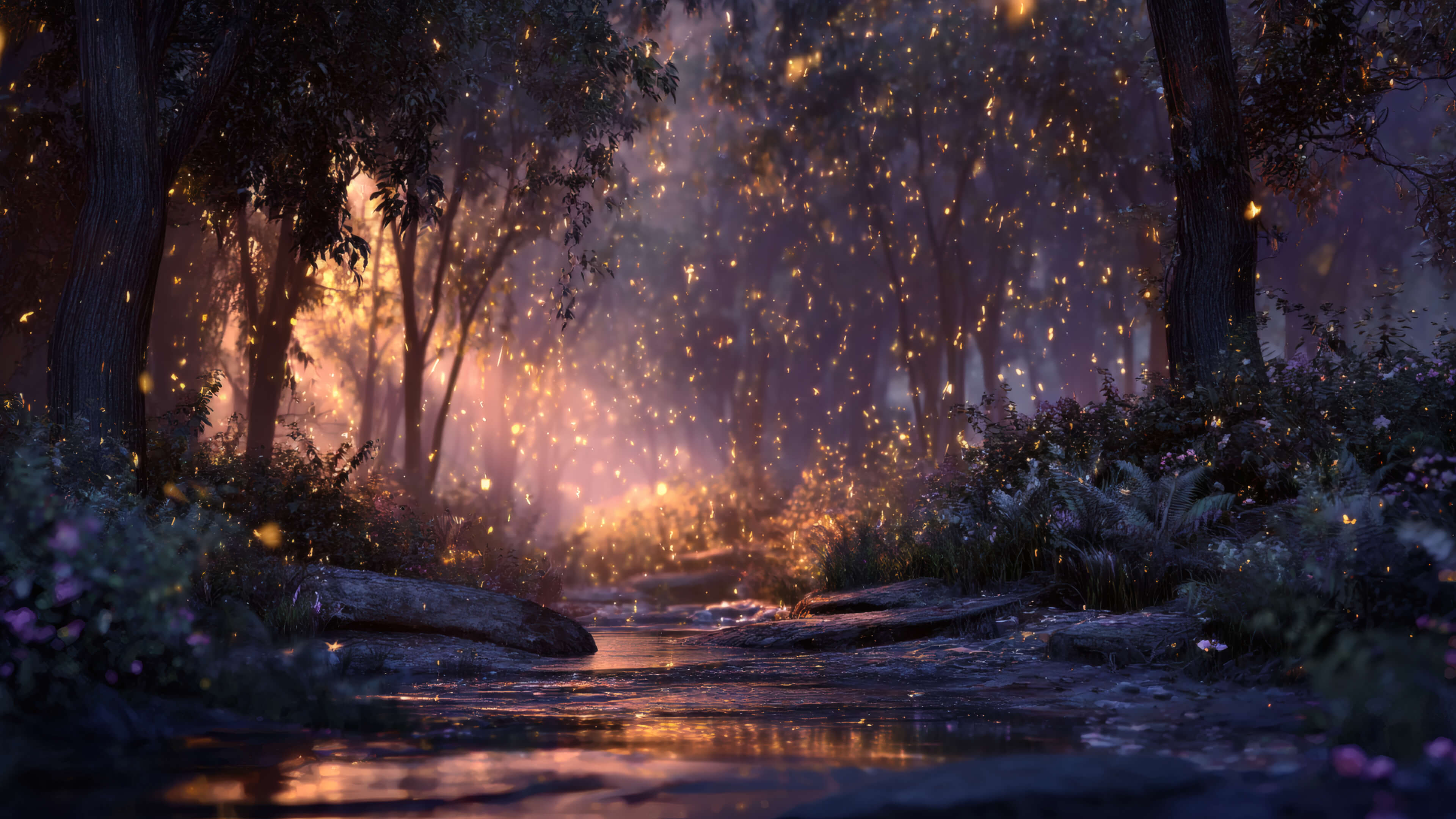 A dreamy, enchanted forest glows in hues of violet, rose, and amber as firefly-like embers dance through the air. Light filters through tall trees and illuminates a tranquil stream weaving between mossy rocks and wildflowers. The scene feels alive, as if nature itself is whispering spells at dusk - a moment suspended between magic and serenity.
