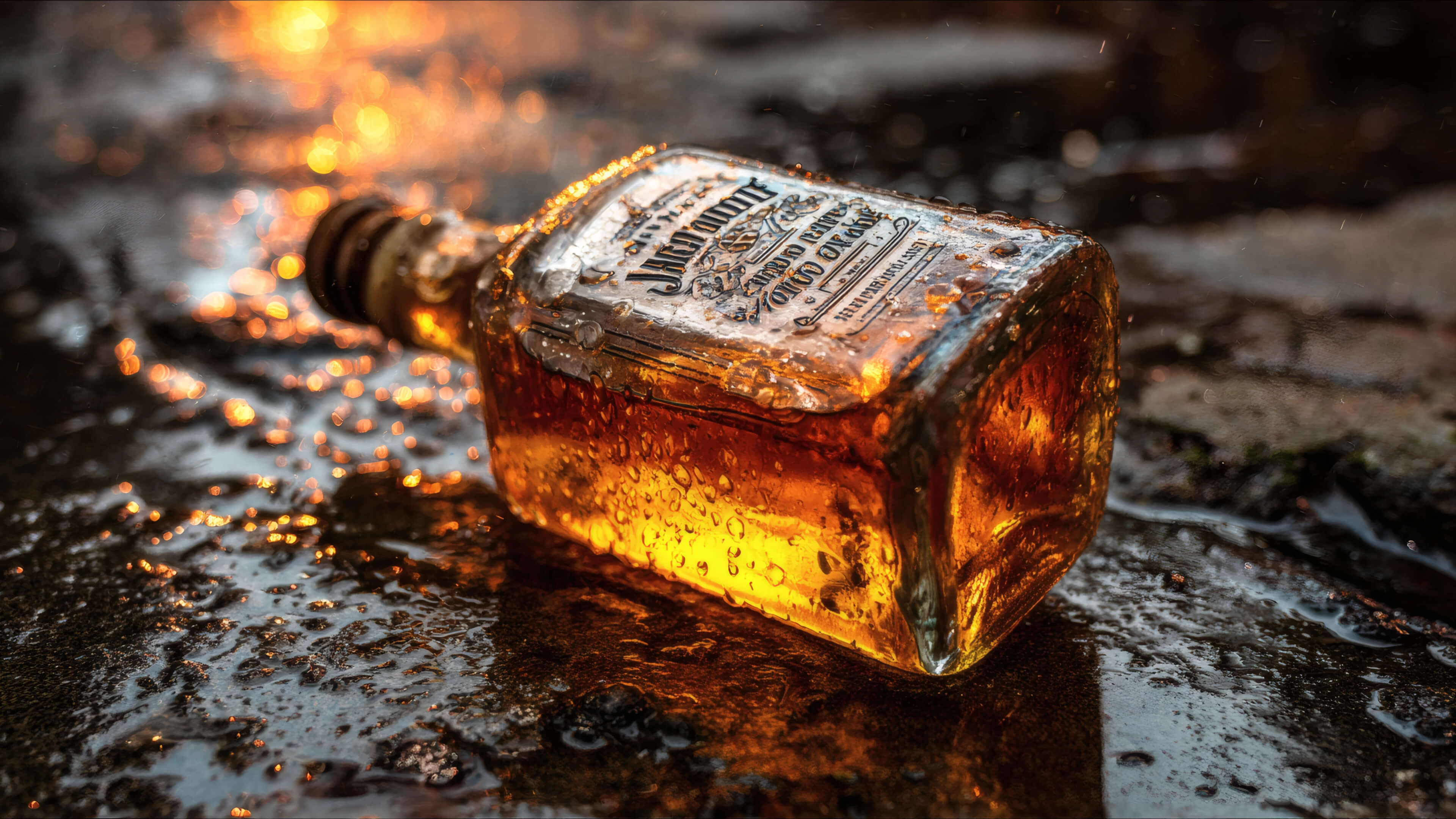 A close-up of a whiskey bottle lying on wet pavement, covered in raindrops and glowing with warm amber tones against a dramatic, rainy backdrop.