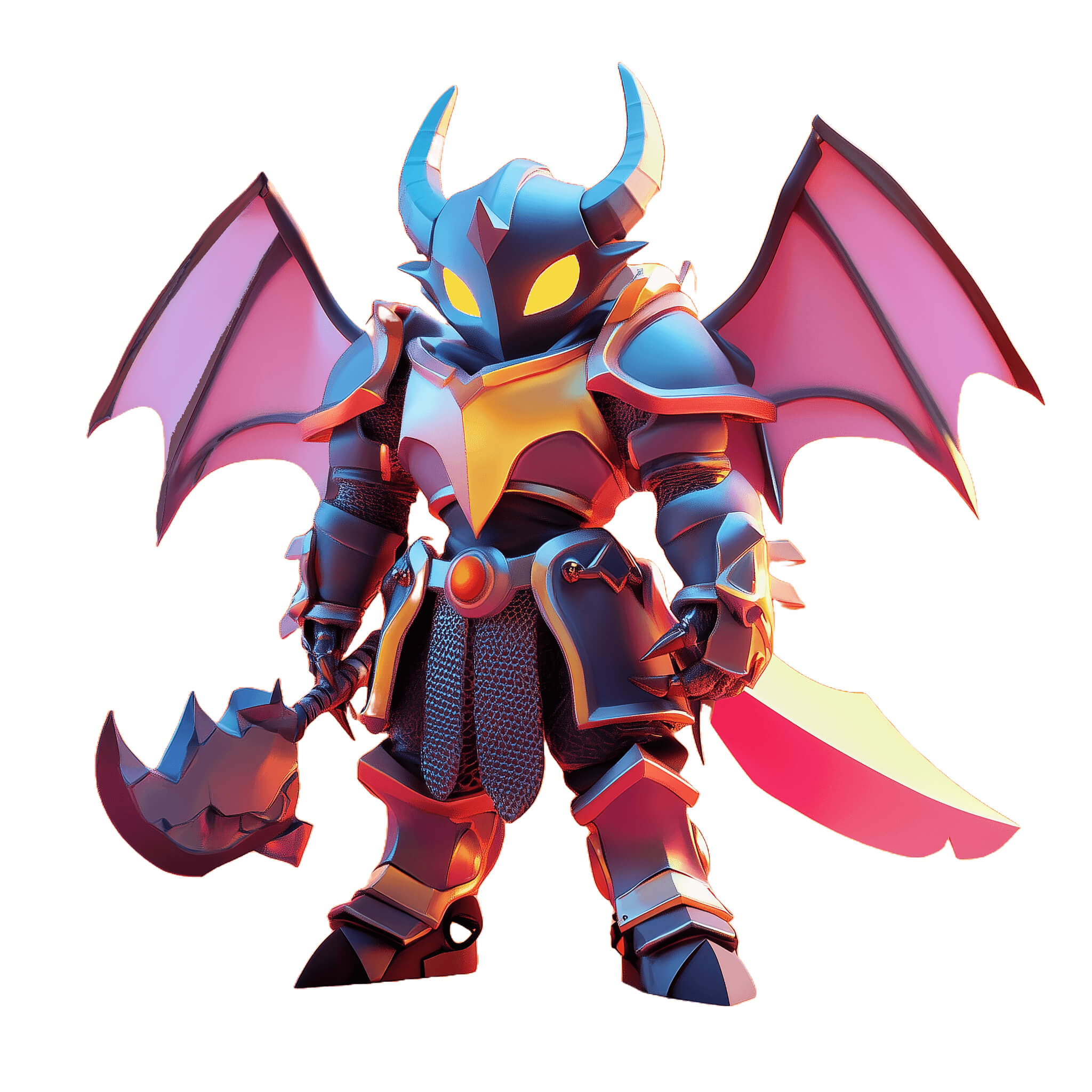 A fearsome 3D character model of a demonic dragon knight clad in spiked, battle-worn armor with glowing eyes that radiate power. His armor fuses mystical metals and scales, while his wings emit a fiery glow, symbolizing his draconic lineage. The knight wields a double-edged battle axe, its dark edges glowing with destructive energy, making him a force of devastation on the battlefield. This character can be featured as a villain, raid boss, or elite warrior in fantasy games or cinematic universes.